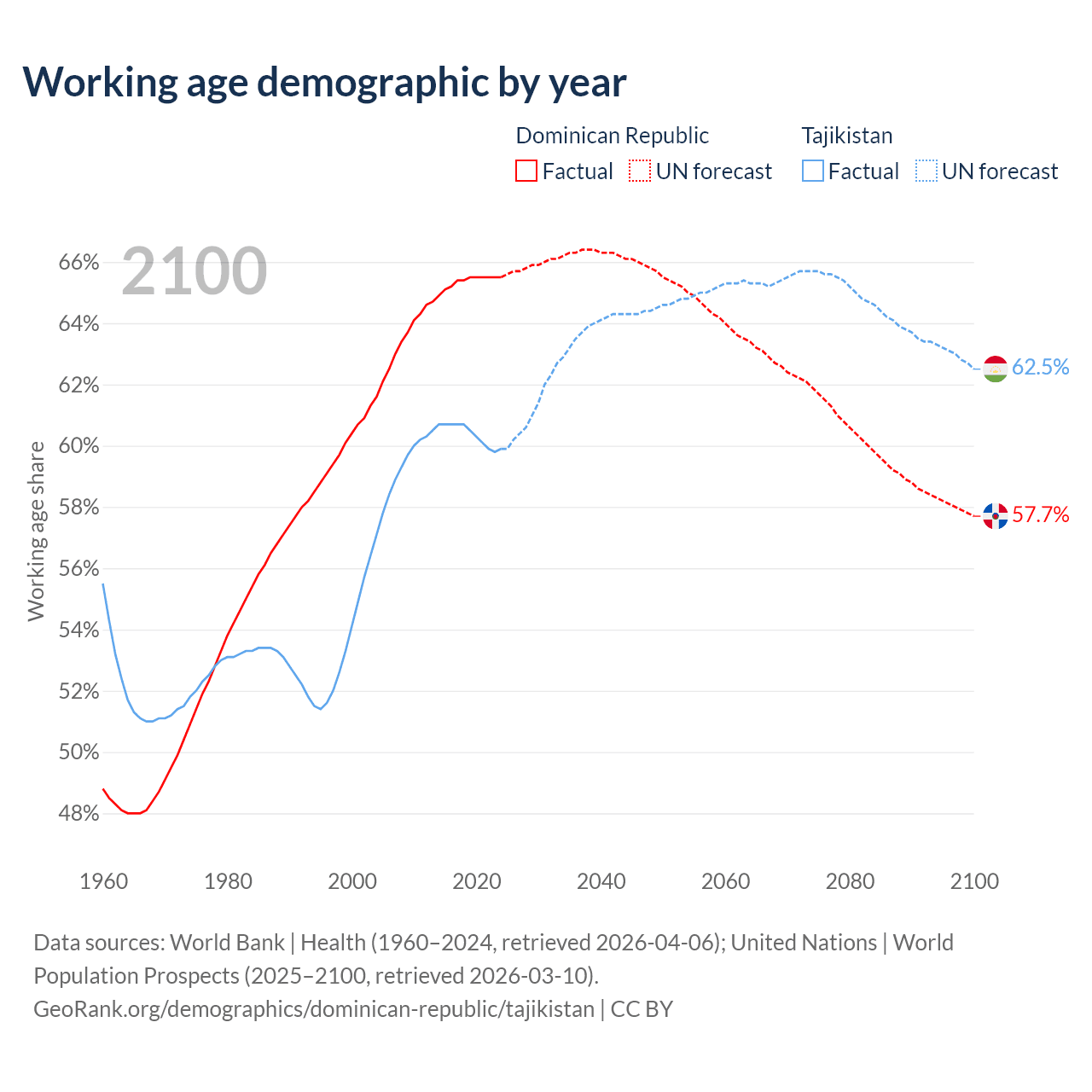 Median age Dominican Republic vs Tajikistan, 1960-2100
