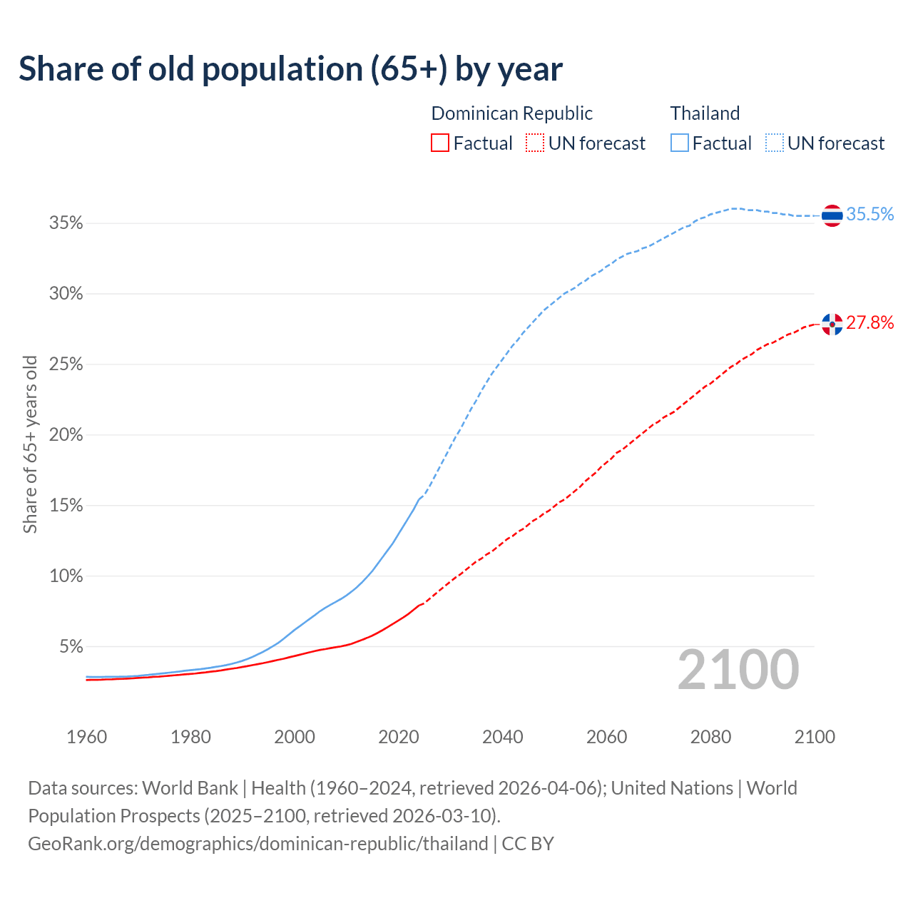 The share of older people aged 65 and over is 7.88% in the Dominican Republic and 15.4% in Thailand. Life expectancy in the Dominican Republic compared to Thailand .
