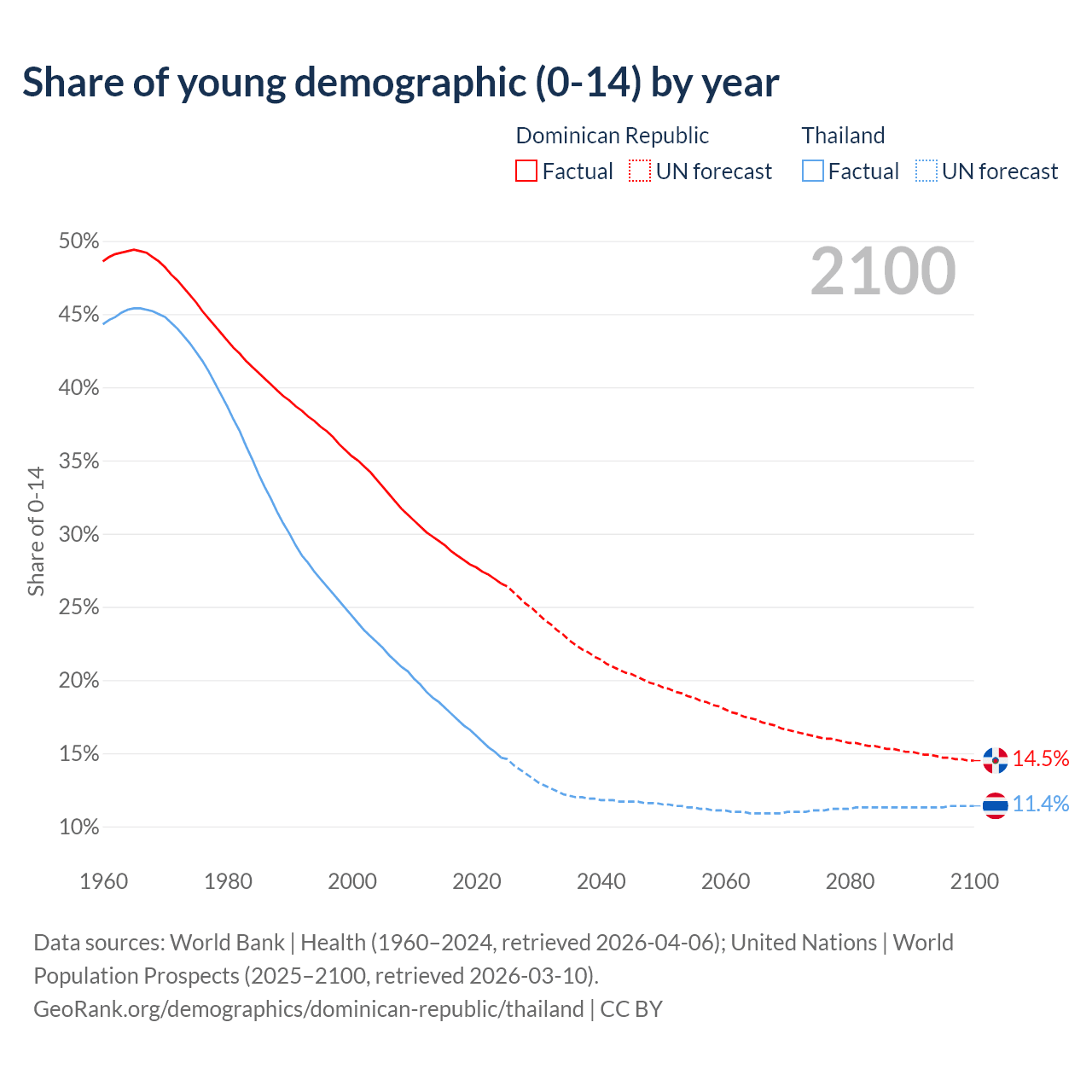 - The share of young demographic (0-15 years old) in the Dominican Republic is 26.6% vs 14.7% in Thailand.