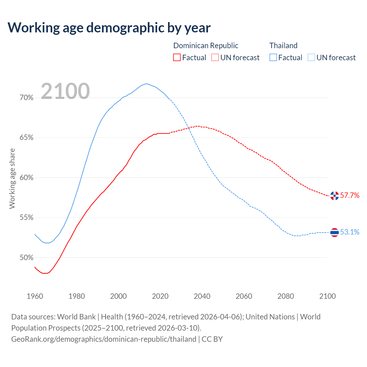 Median age Dominican Republic vs Thailand, 1960-2100