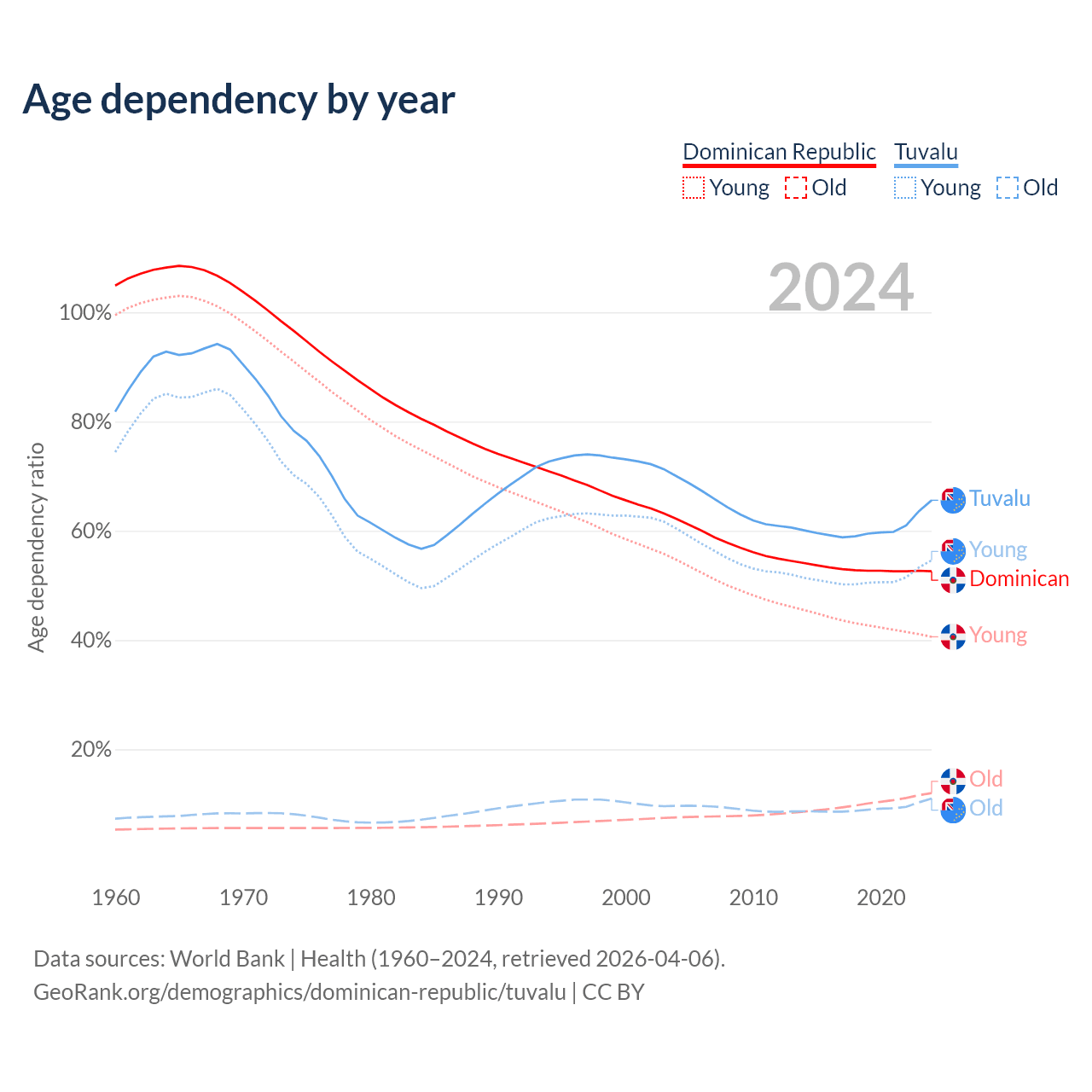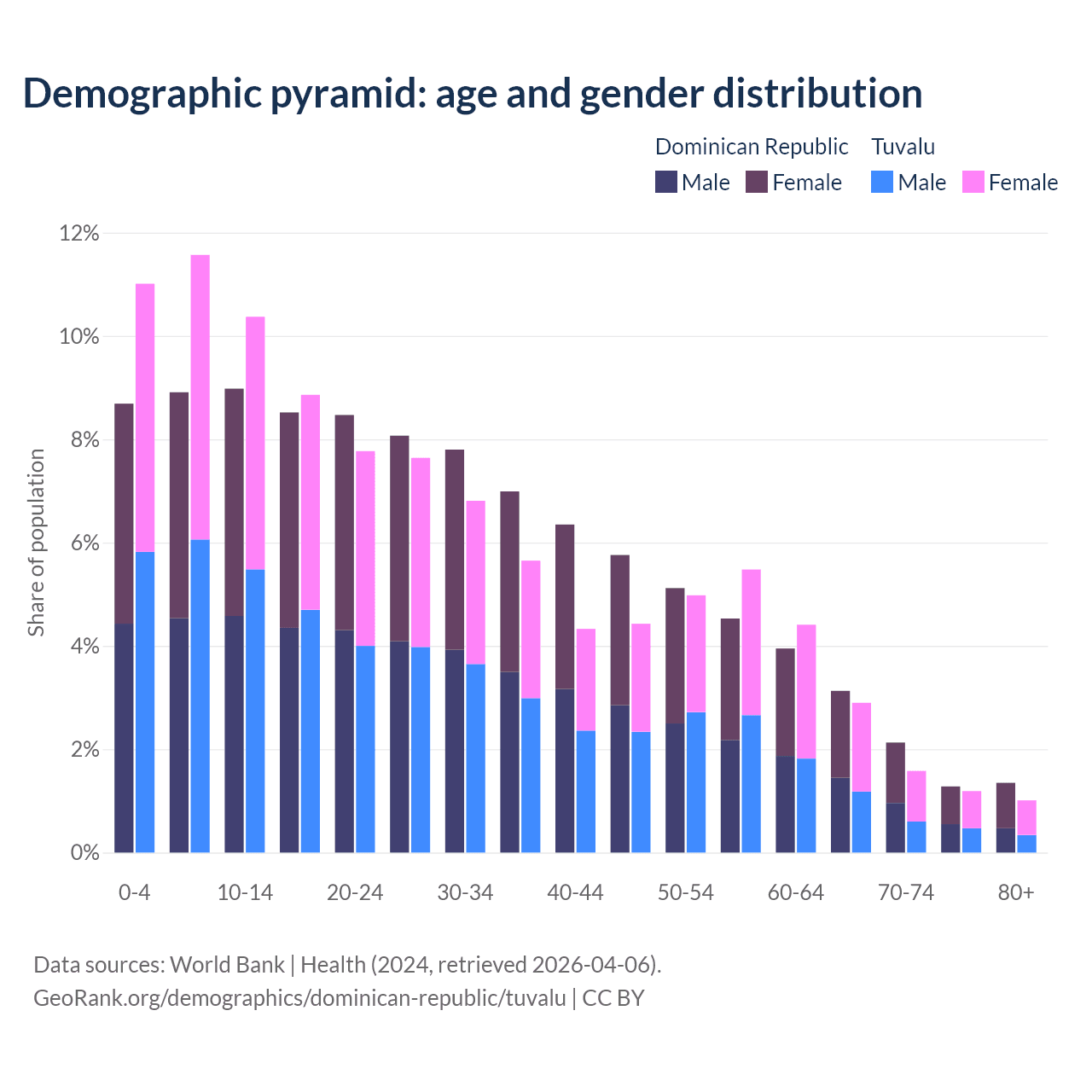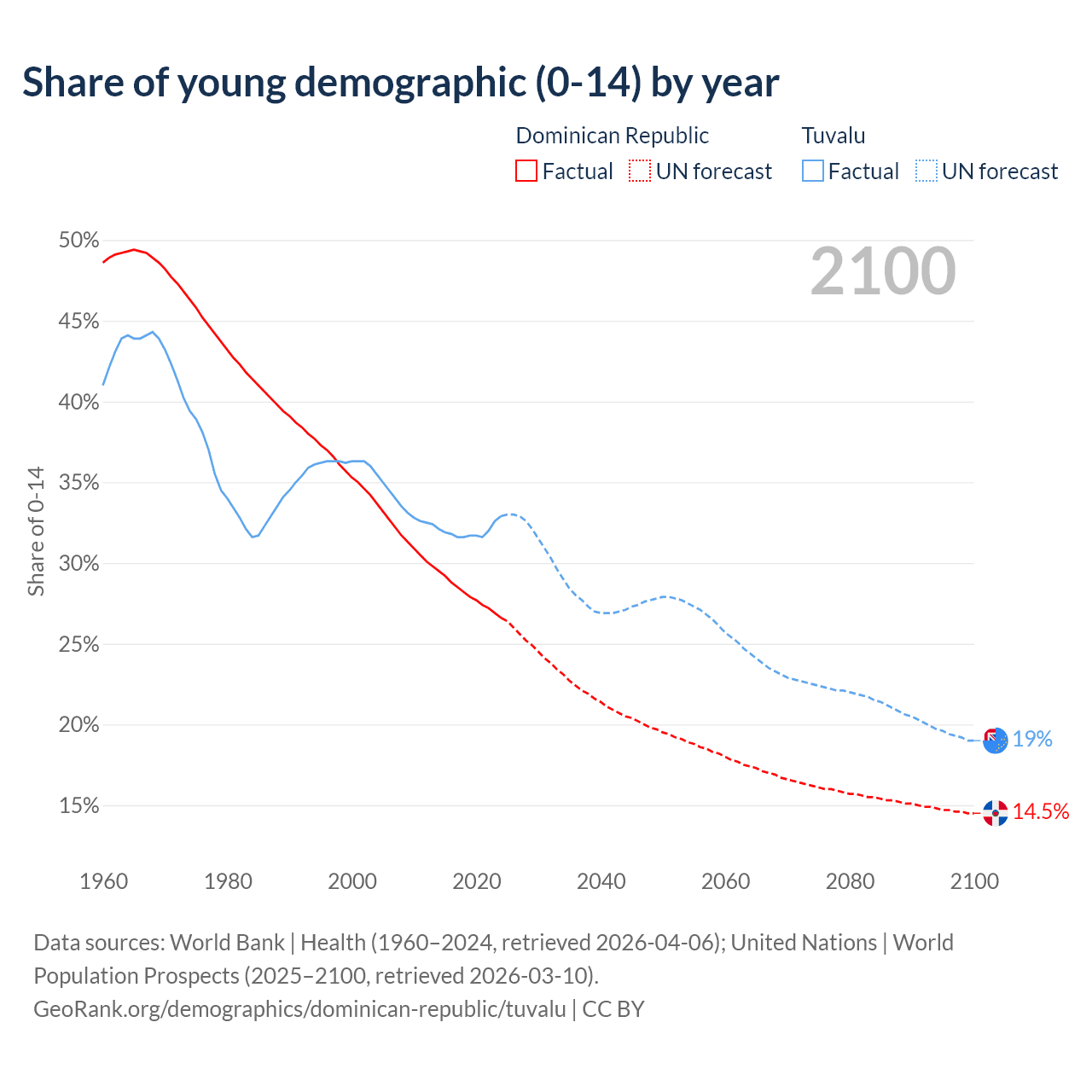 - The share of young demographic (0-15 years old) in the Dominican Republic is 26.6% vs 32.9% in Tuvalu.
