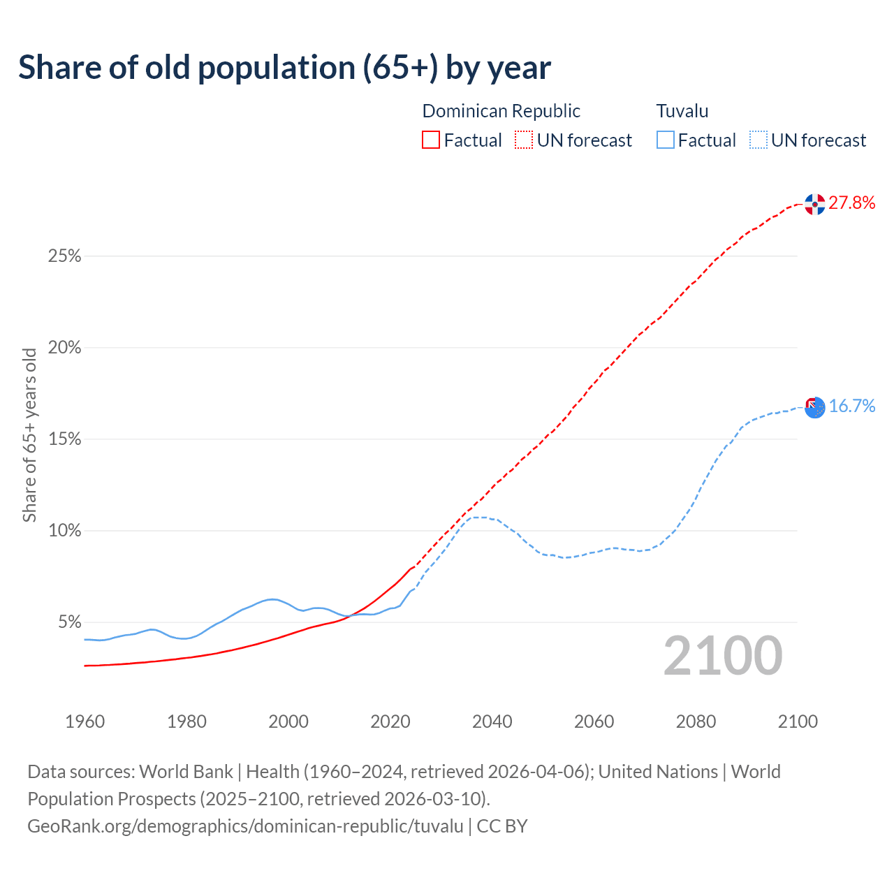- The share of old-age demographic (65+) in the Dominican Republic is 7.88% vs 6.67% in Tuvalu.