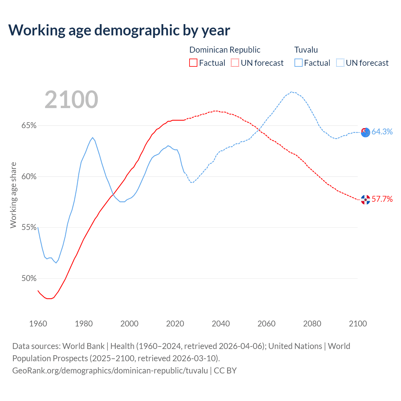 - The Dominican Republic has 7.63M working age adults (aged 15-64) vs 5.64K in Tuvalu.