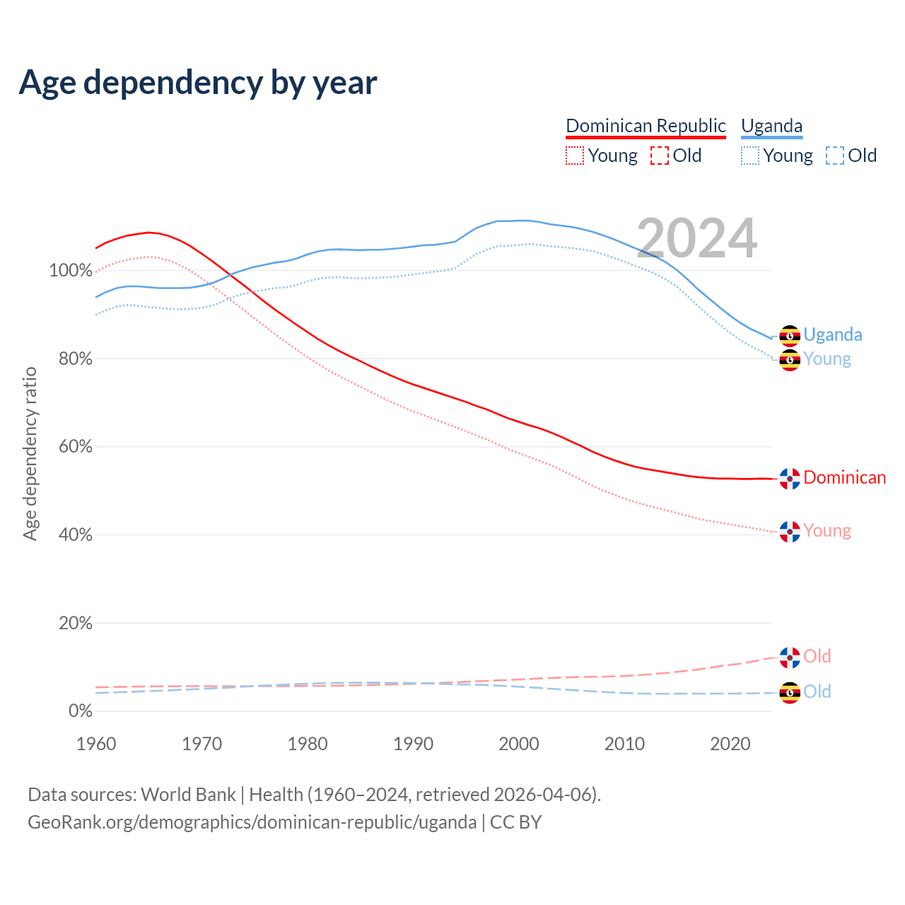 - The Dominican Republic is ranked 112/196 by median age (oldest to youngest) vs 187/196 for Uganda.