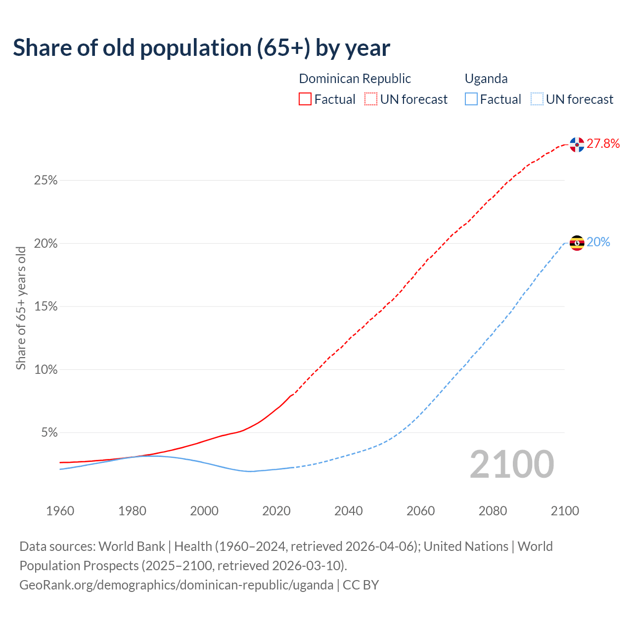 The share of older people aged 65 and over is 7.88% in the Dominican Republic and 2.19% in Uganda. Life expectancy in the Dominican Republic compared to Uganda .