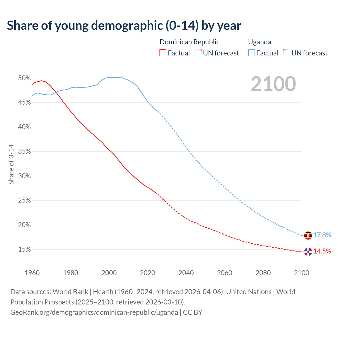 - The share of young demographic (0-15 years old) in the Dominican Republic is 26.6% vs 43.5% in Uganda.