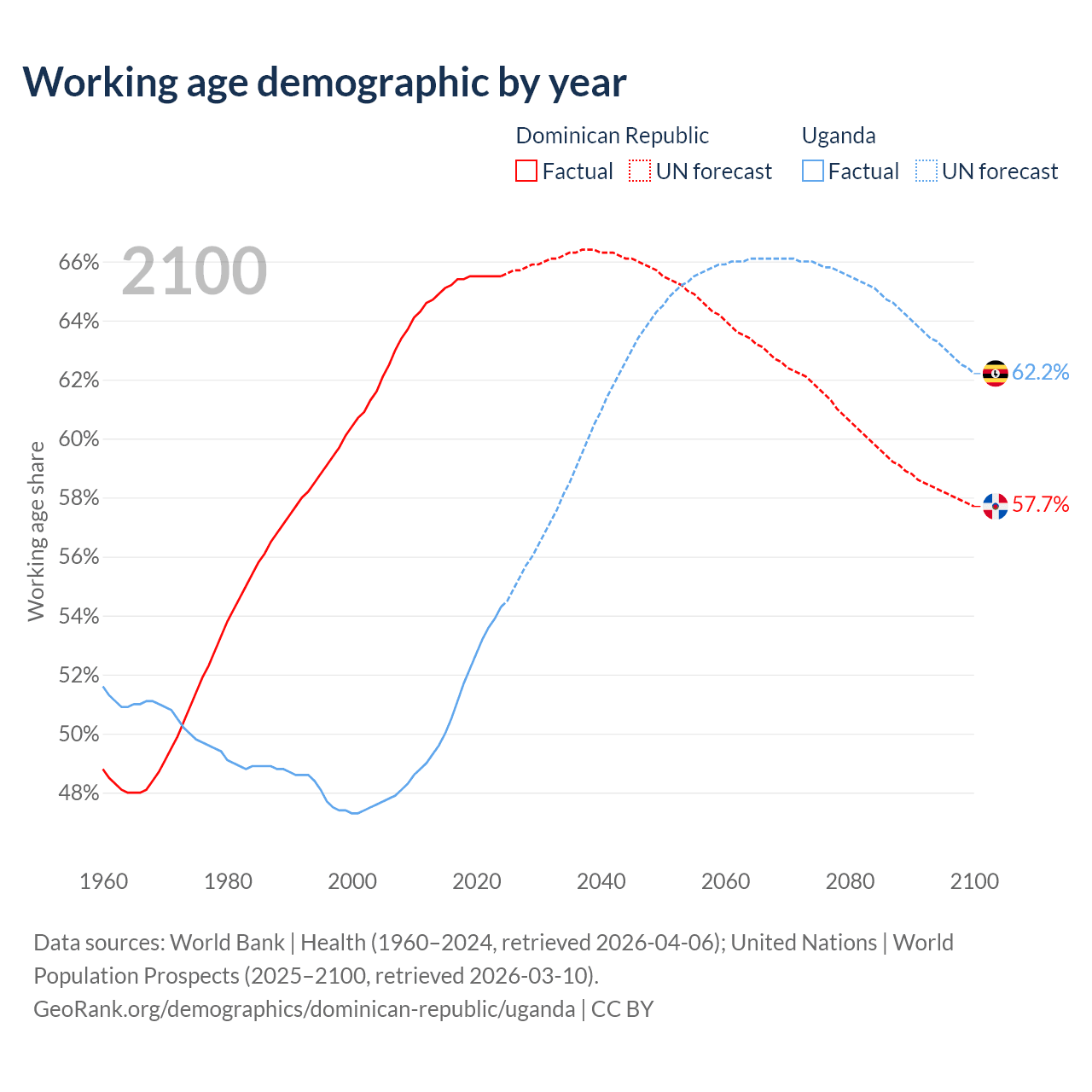 Median age Dominican Republic vs Uganda, 1960-2100