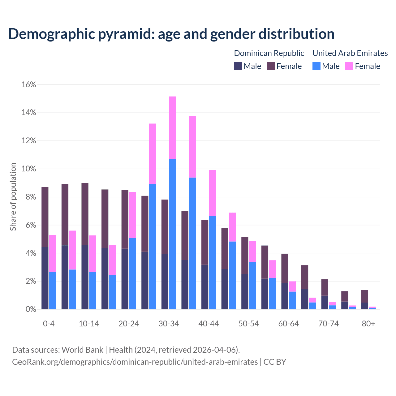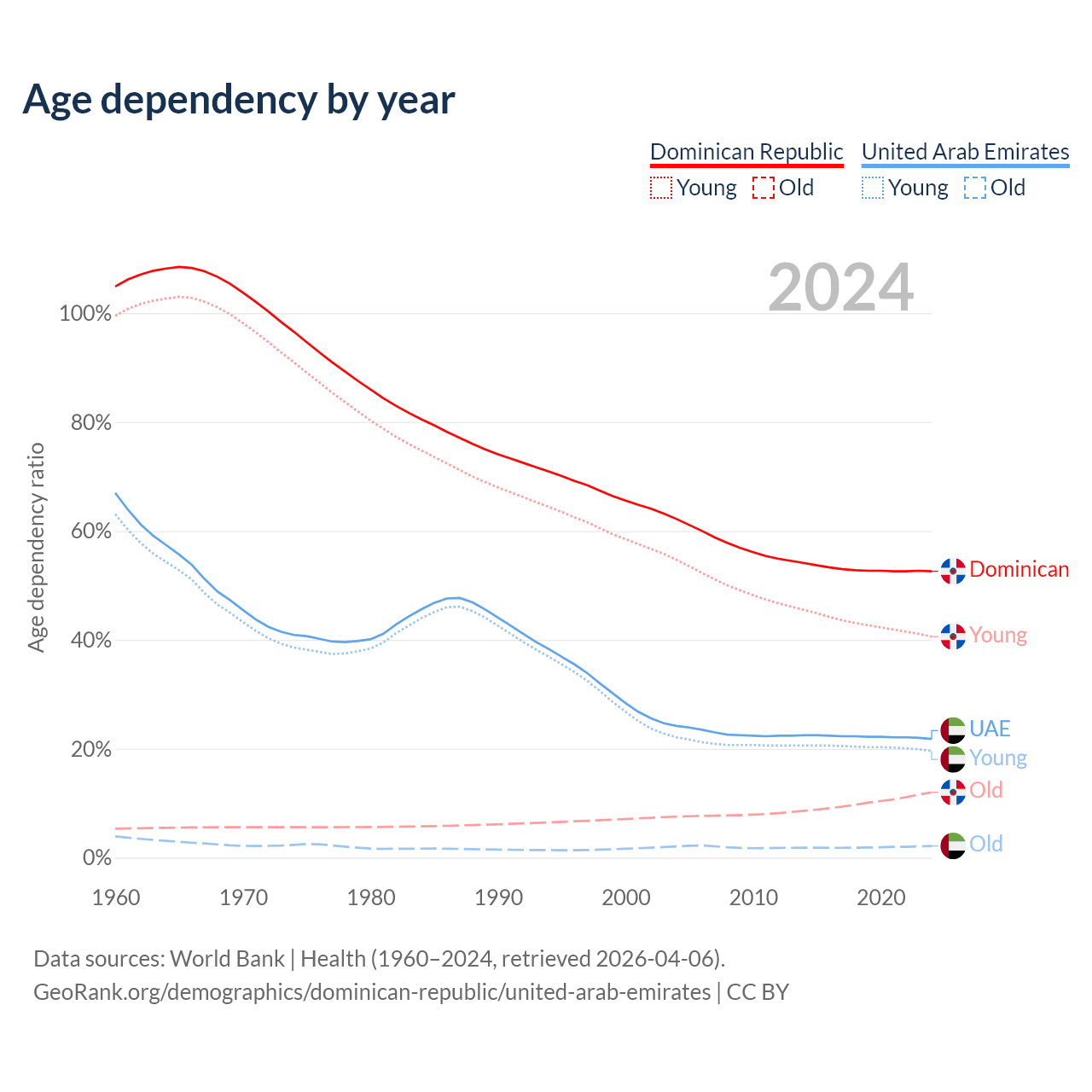 - The share of old-age demographic (65+) in the Dominican Republic is 7.88% vs 1.77% in the United Arab Emirates.