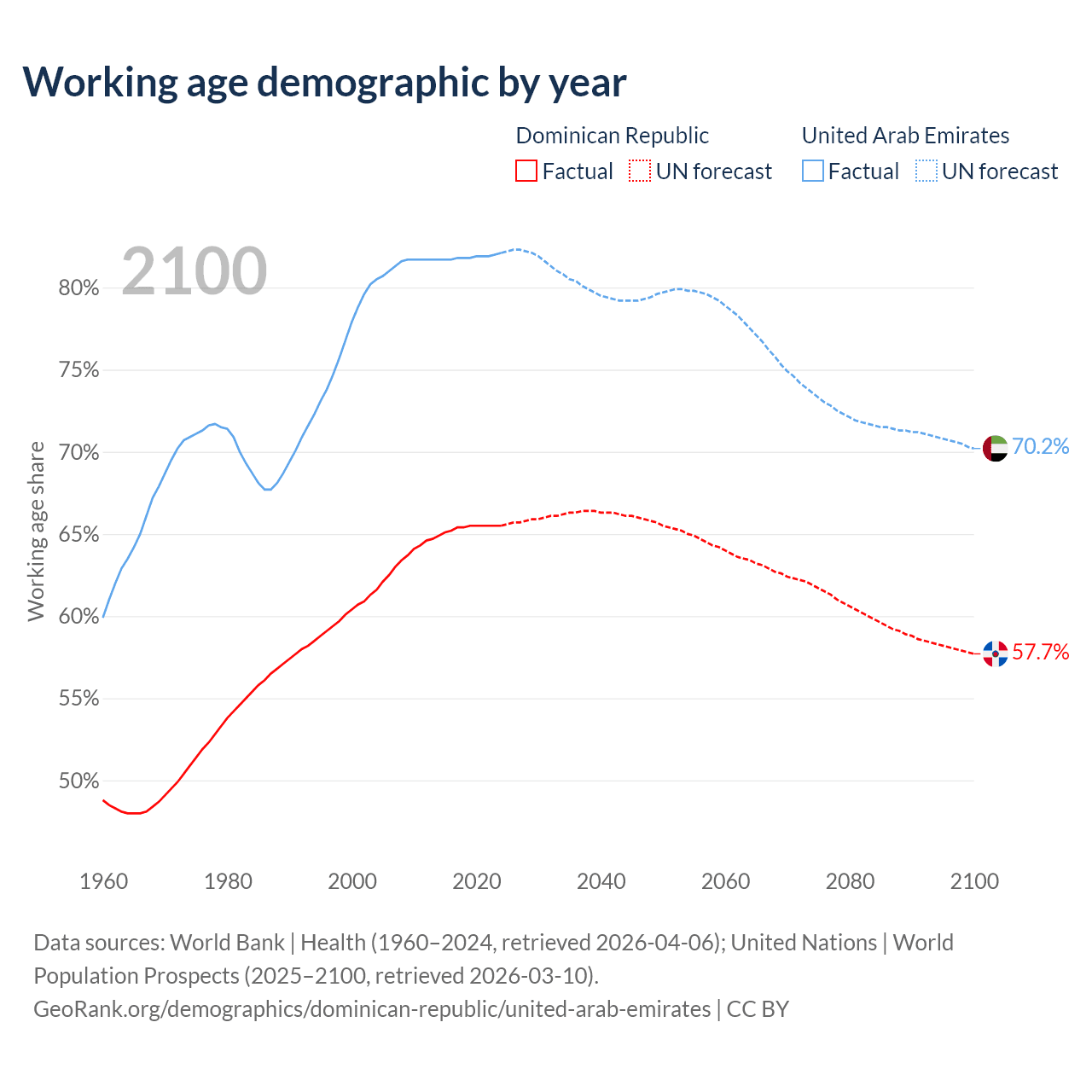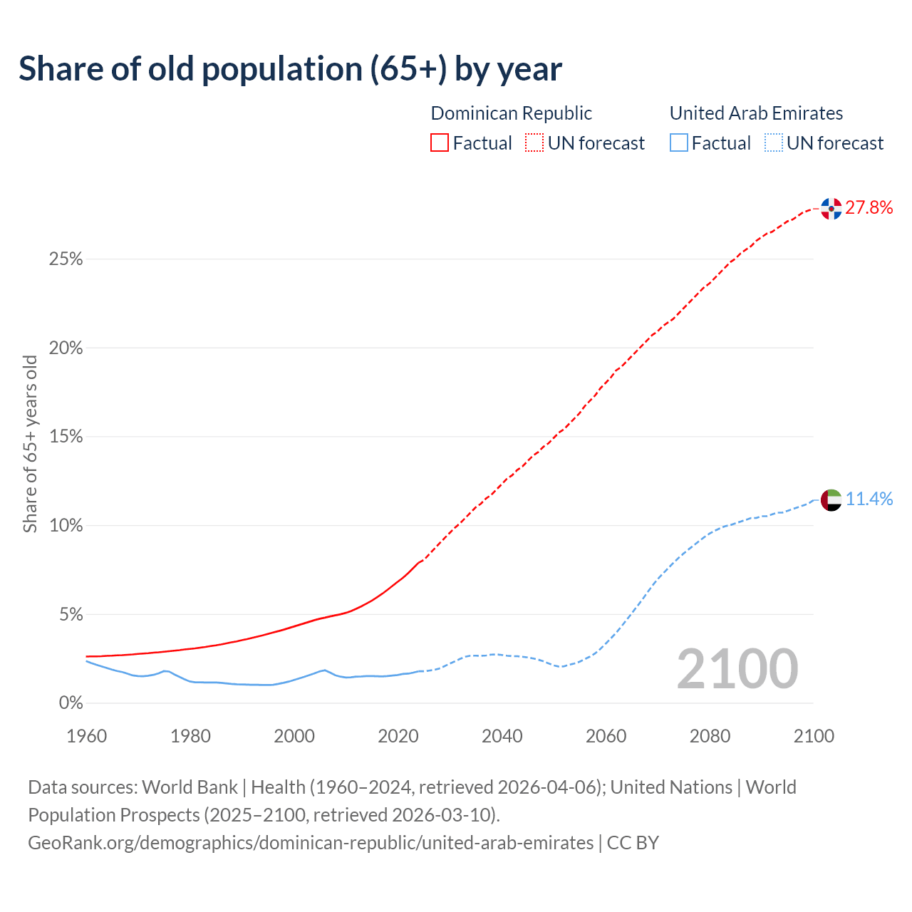 The share of older people aged 65 and over is 7.88% in the Dominican Republic and 1.77% in the United Arab Emirates. Life expectancy in the Dominican Republic compared to the United Arab Emirates .