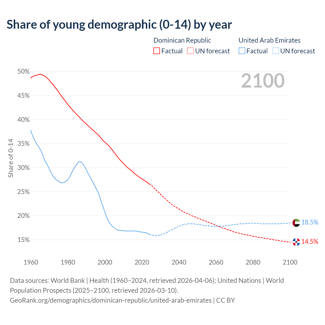 - The share of young demographic (0-15 years old) in the Dominican Republic is 26.6% vs 16.1% in the United Arab Emirates.