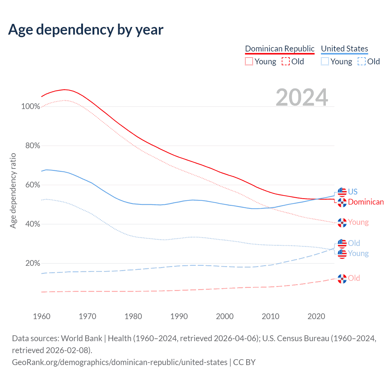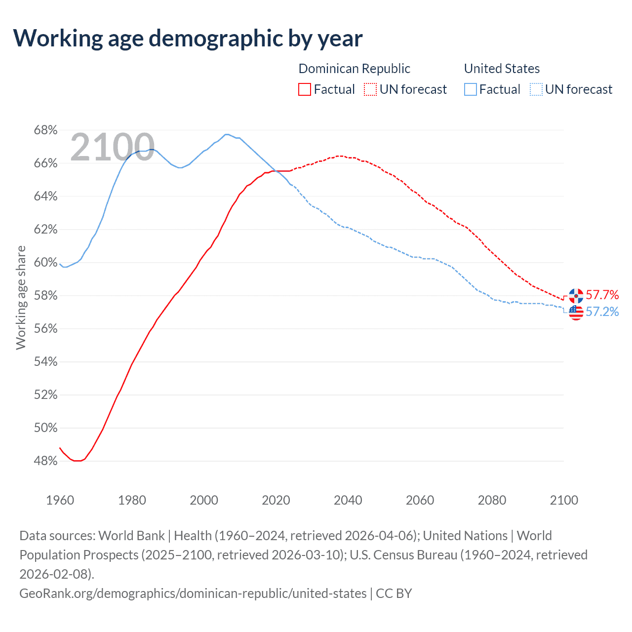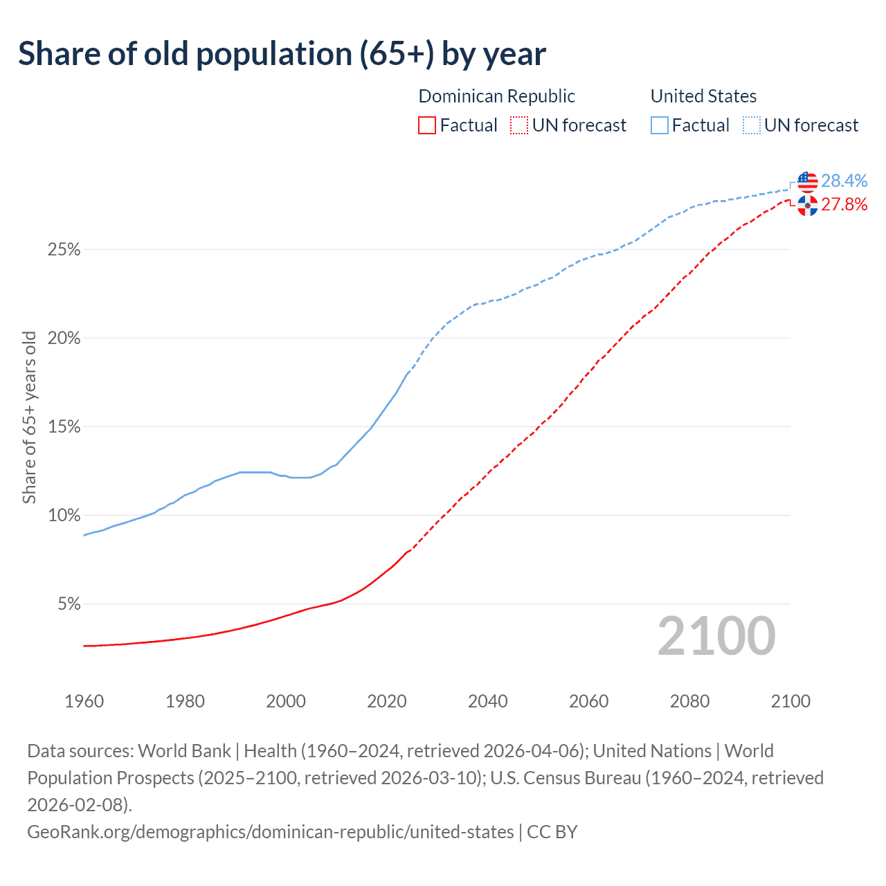 - The share of old-age demographic (65+) in the Dominican Republic is 7.88% vs 17.9% in the United States.