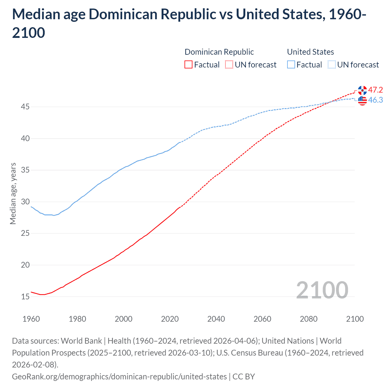 - The Dominican Republic is ranked 112/196 by median age (oldest to youngest) vs 50/196 for the United States.