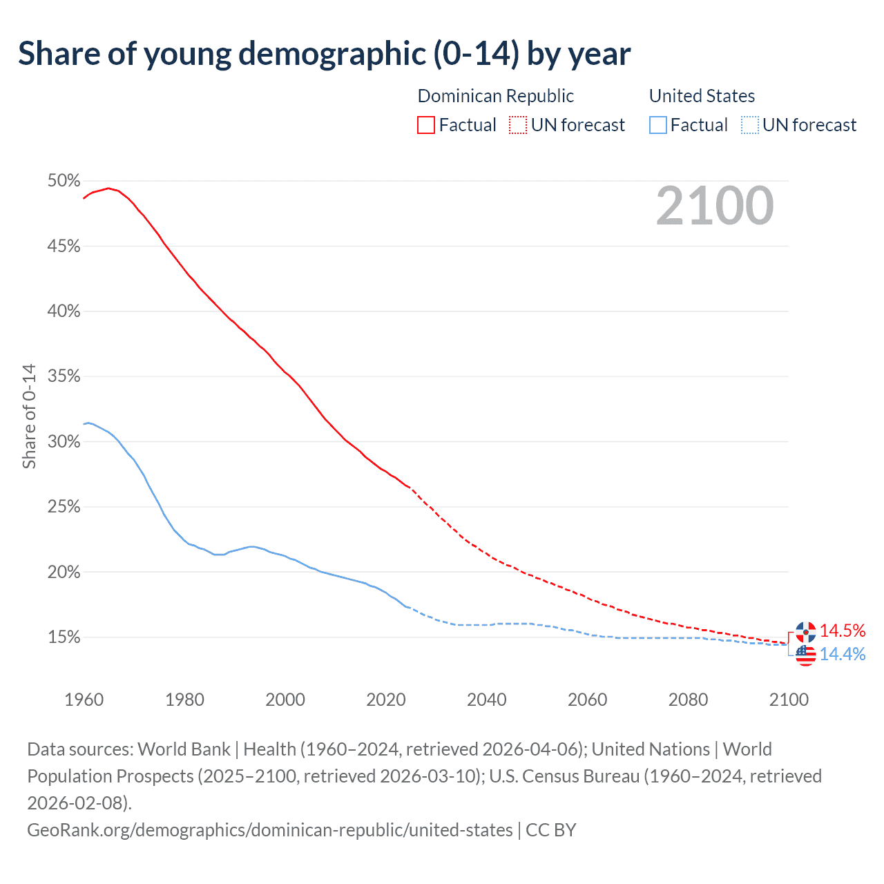 - The share of young demographic (0-15 years old) in the Dominican Republic is 26.6% vs 17.3% in the United States.