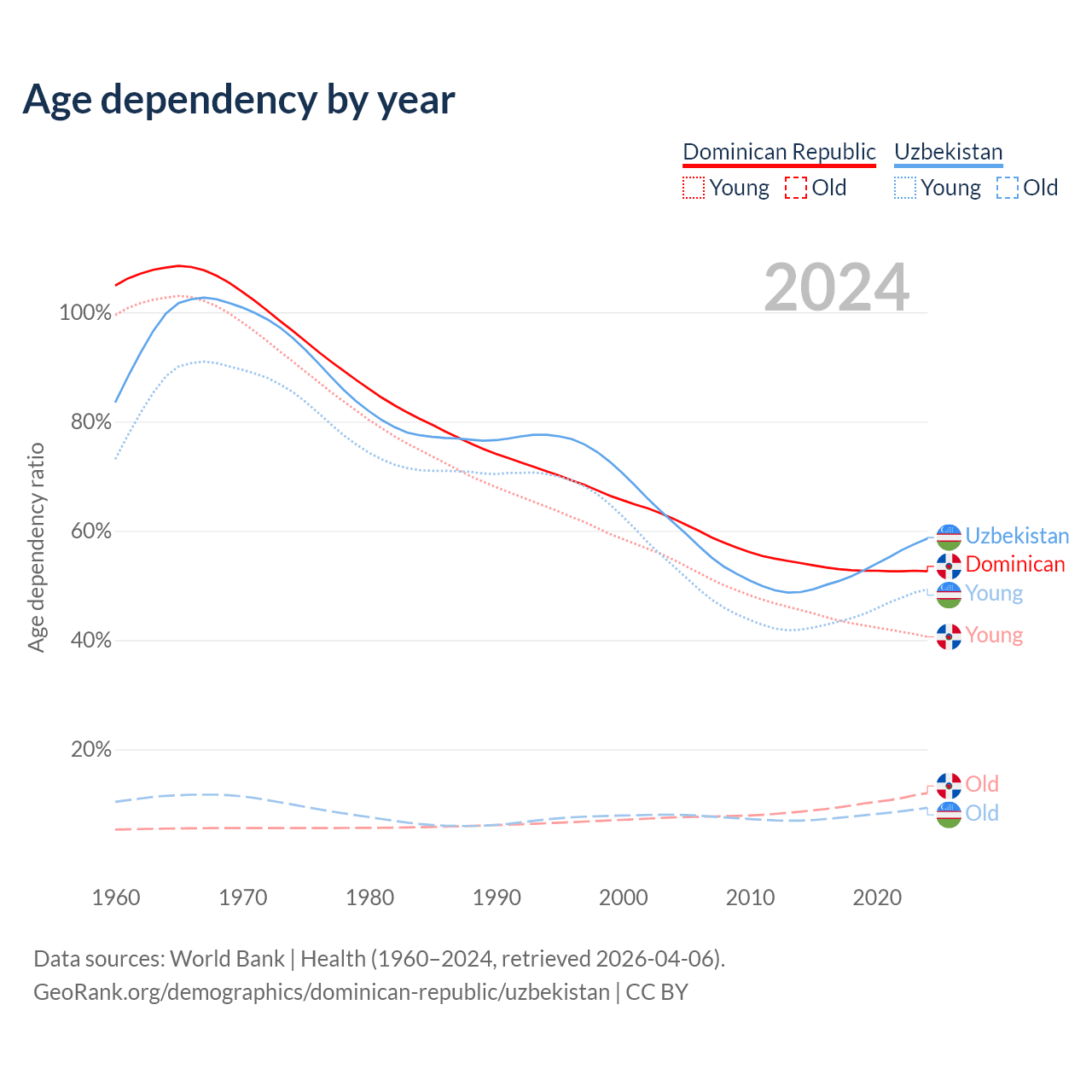 Data sources: World Bank | Health (1960–2024, retrieved 2026-04-06); U.S. Census Bureau (1960–2024, retrieved 2026-02-08).