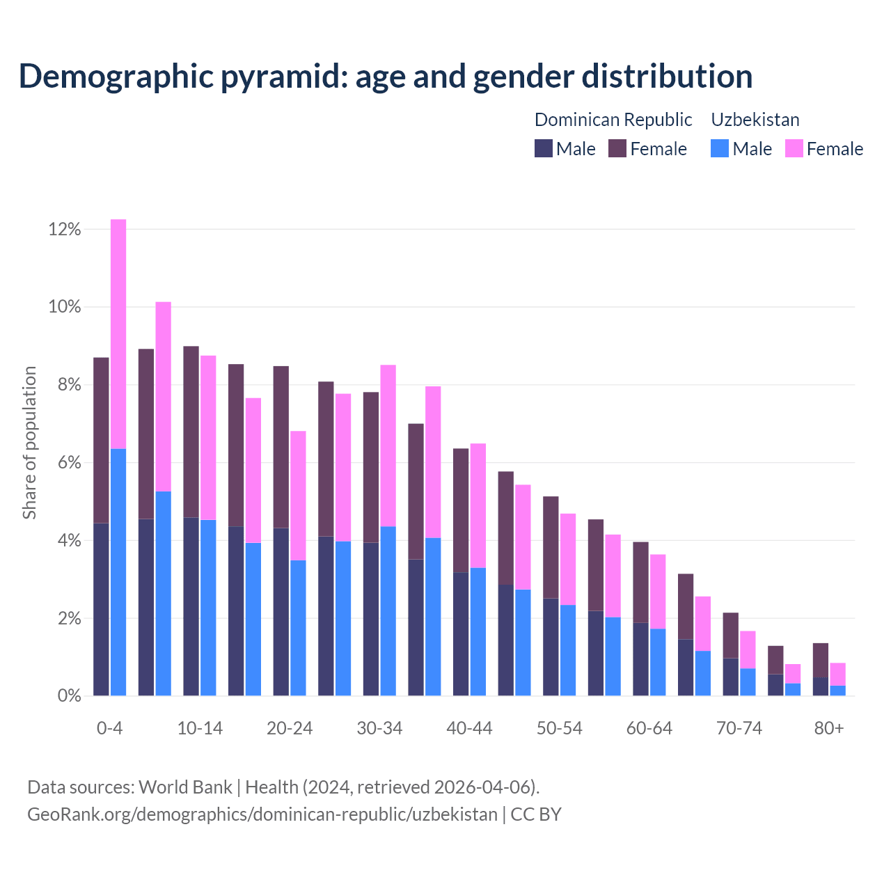 - As of 2026, the population of the Dominican Republic is 11.6M vs 37.9M in Uzbekistan - 3.26 times difference.