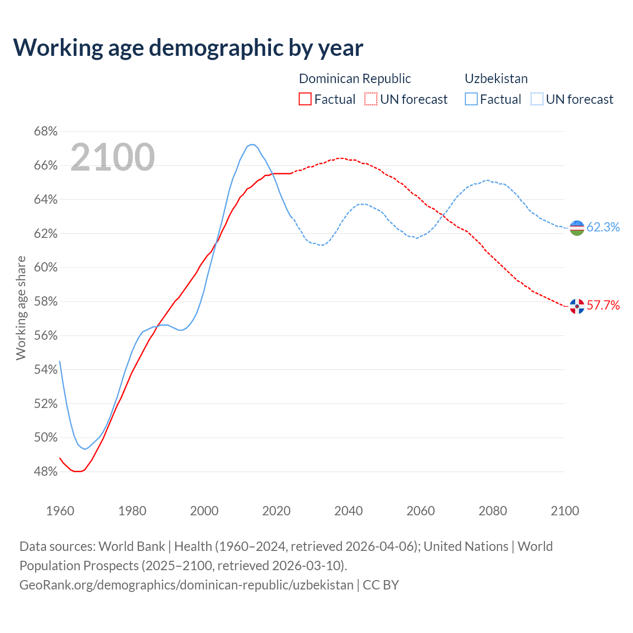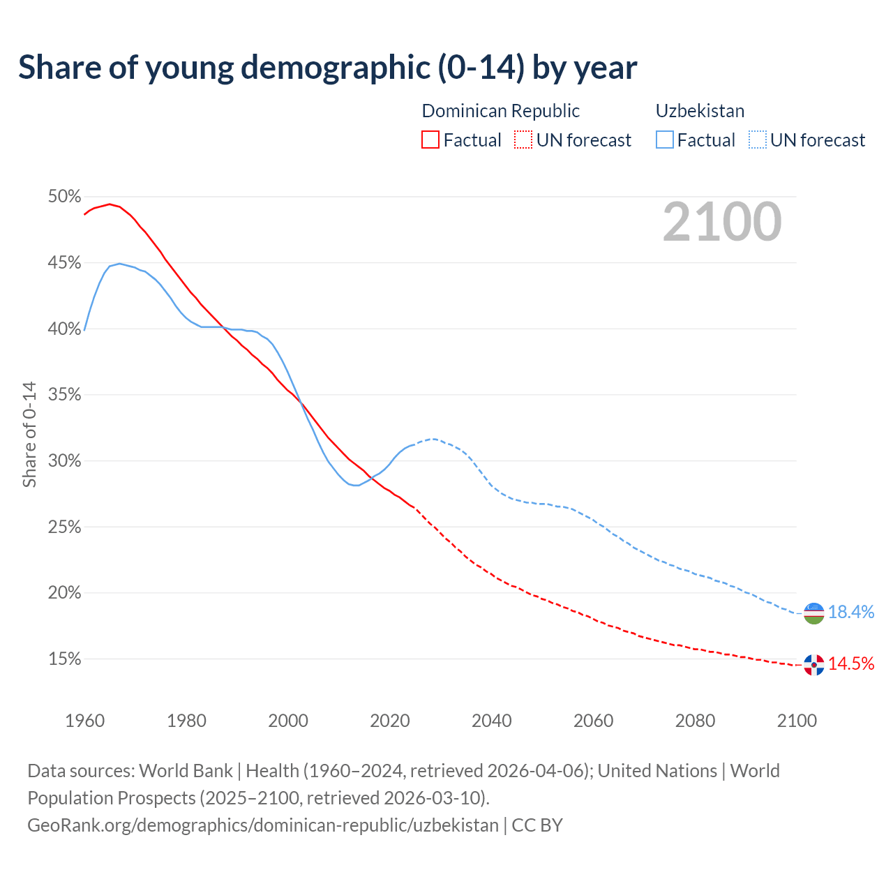 Median age Dominican Republic vs Uzbekistan, 1960-2100