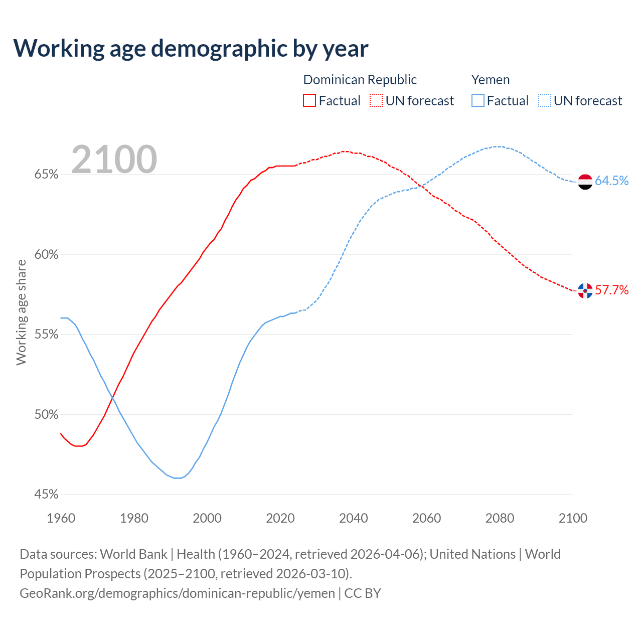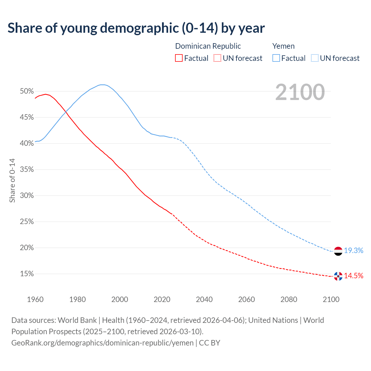 - The share of young demographic (0-15 years old) in the Dominican Republic is 26.6% vs 41.1% in Yemen.