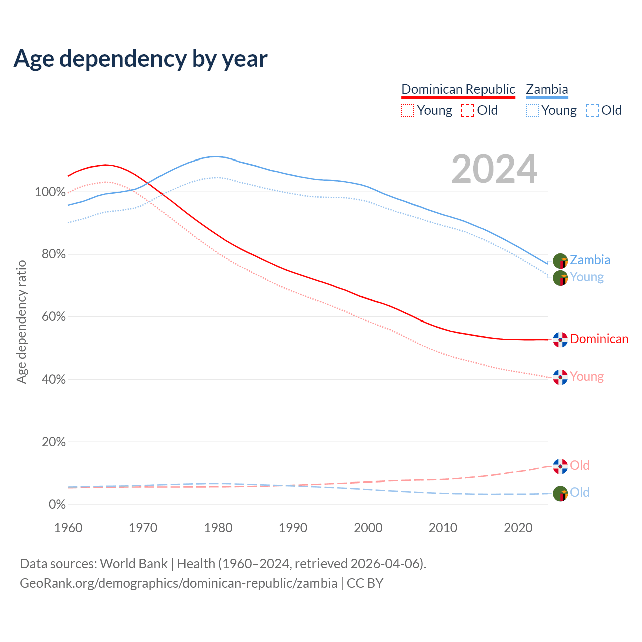 The share of older people aged 65 and over is 7.88% in the Dominican Republic and 1.95% in Zambia. Life expectancy in the Dominican Republic compared to Zambia .