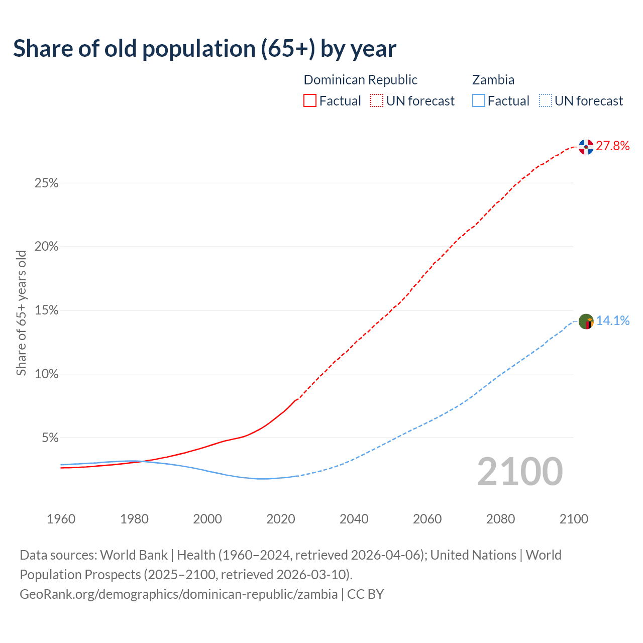 - The share of old-age demographic (65+) in the Dominican Republic is 7.88% vs 1.95% in Zambia.