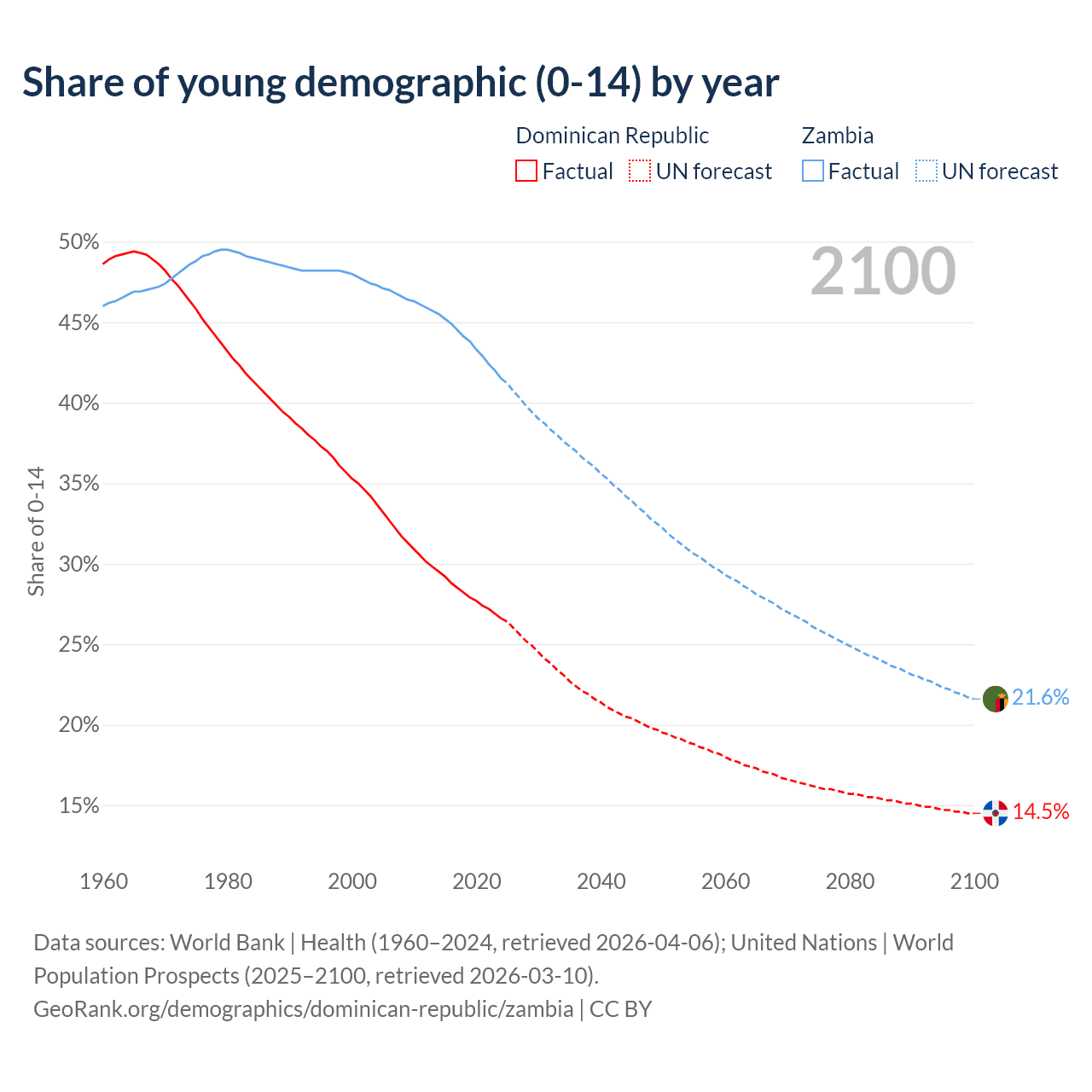 - The share of young demographic (0-15 years old) in the Dominican Republic is 26.6% vs 41.5% in Zambia.