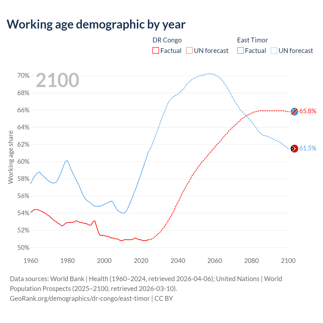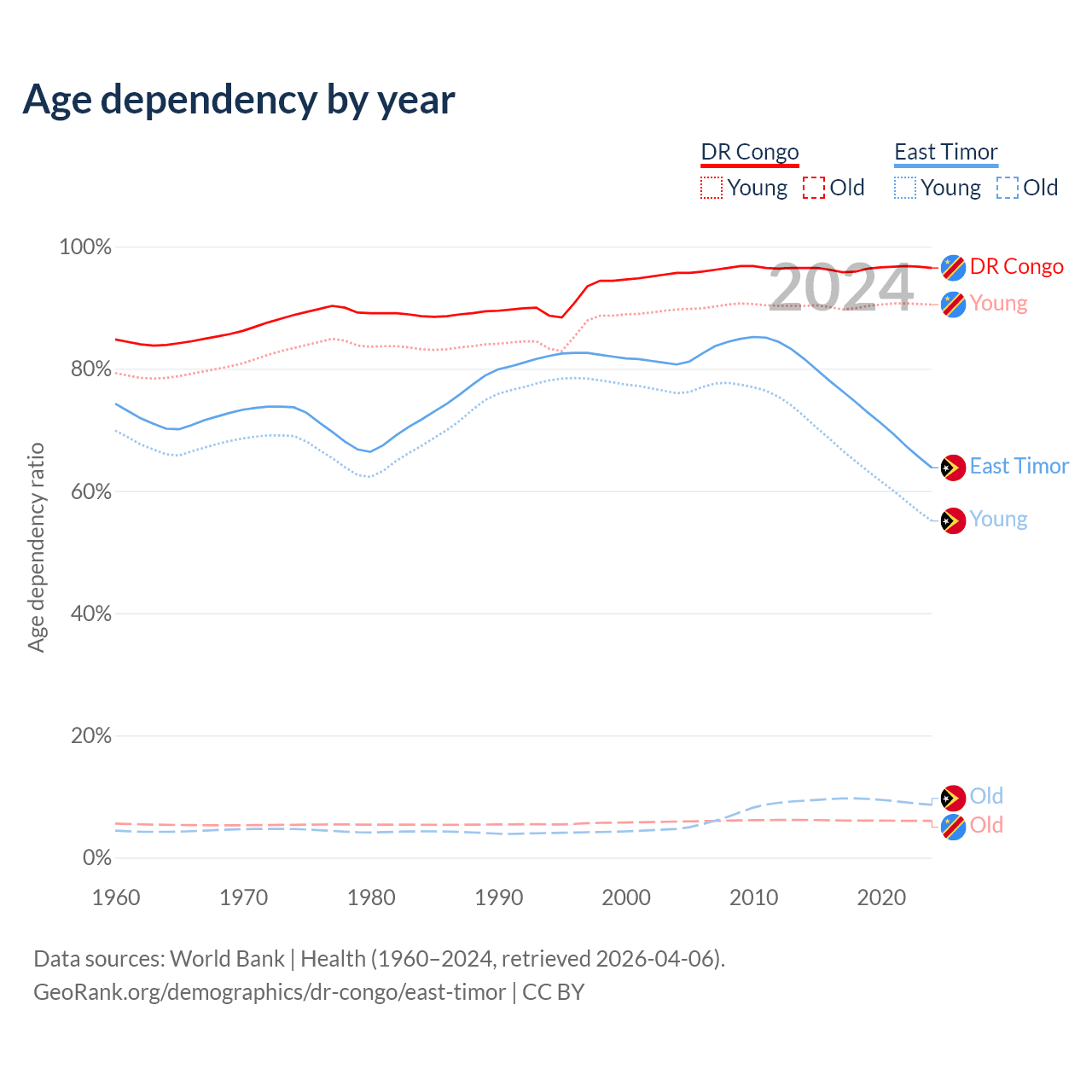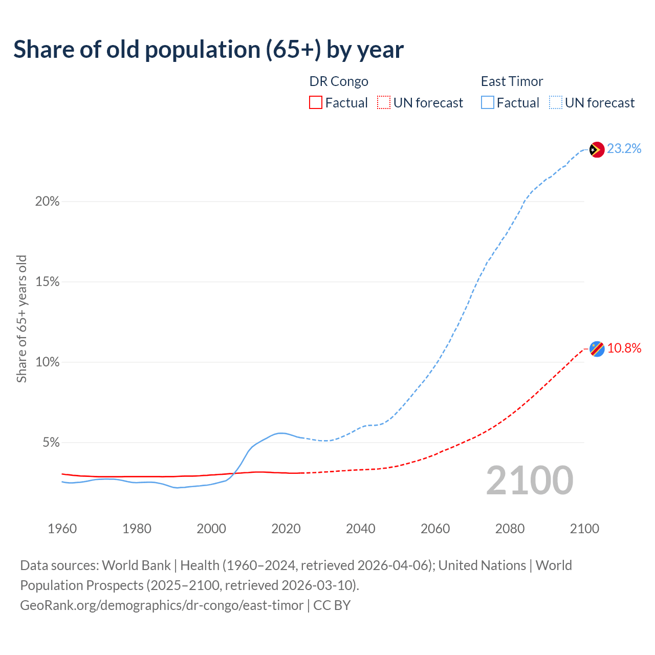 - The share of old-age demographic (65+) in the DR Congo is 3.08% vs 5.28% in East Timor.