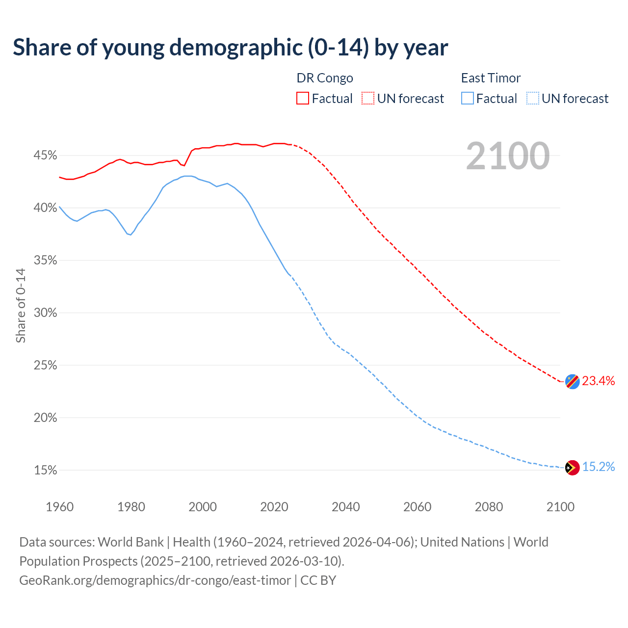- The share of young demographic (0-15 years old) in the DR Congo is 46% vs 33.7% in East Timor.