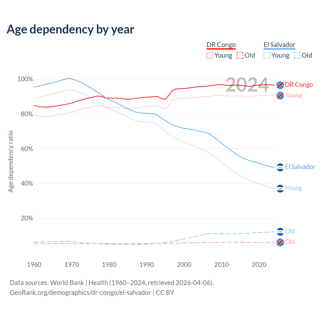 - The share of old-age demographic (65+) in the DR Congo is 3.08% vs 8.15% in El Salvador.