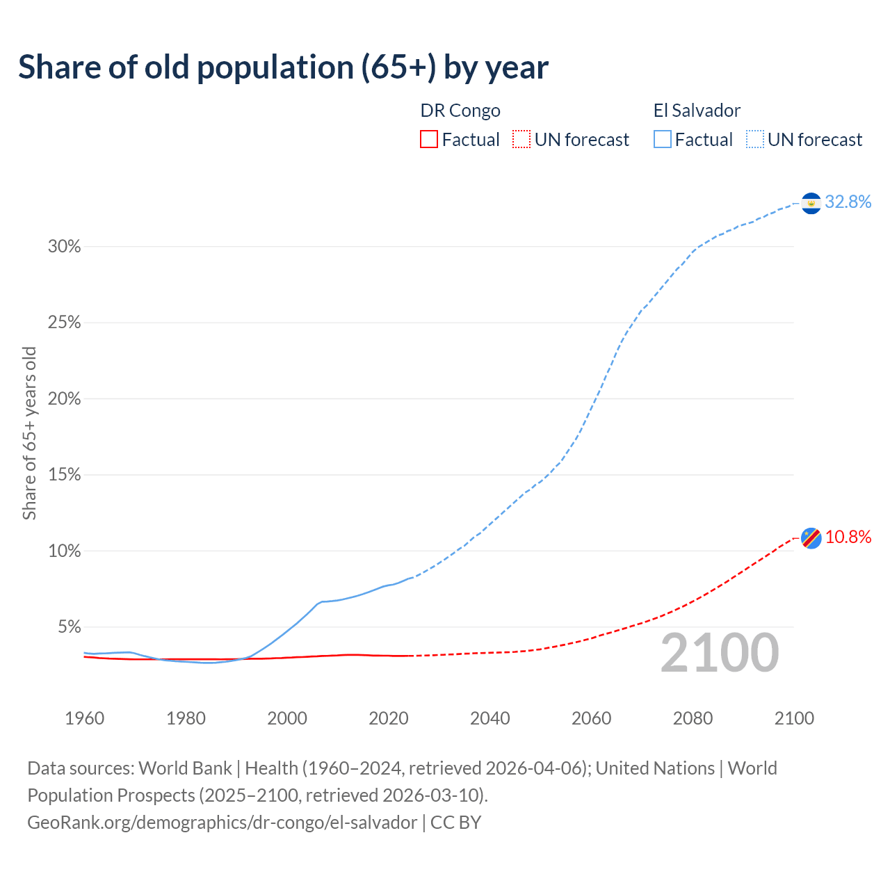 The share of older people aged 65 and over is 3.08% in the DR Congo and 8.15% in El Salvador. Life expectancy in the DR Congo compared to El Salvador .