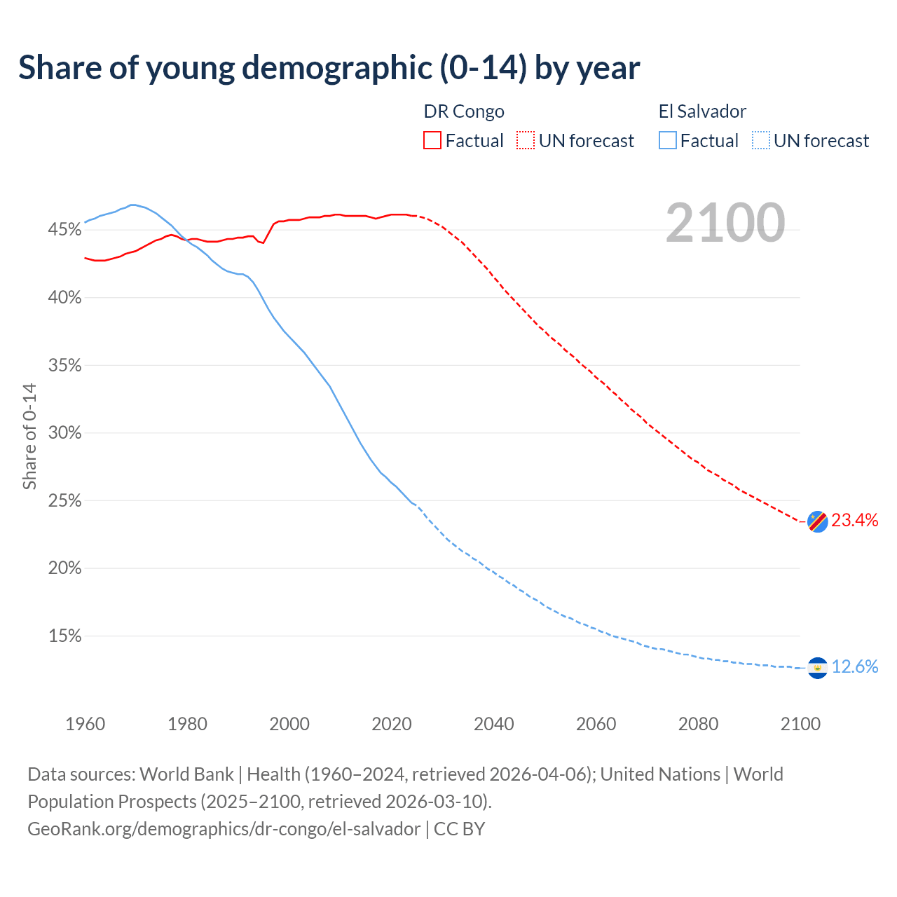 - The share of young demographic (0-15 years old) in the DR Congo is 46% vs 24.8% in El Salvador.