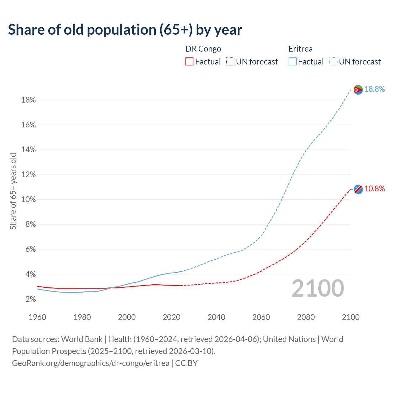 - The share of old-age demographic (65+) in the DR Congo is 3.08% vs 4.2% in Eritrea.