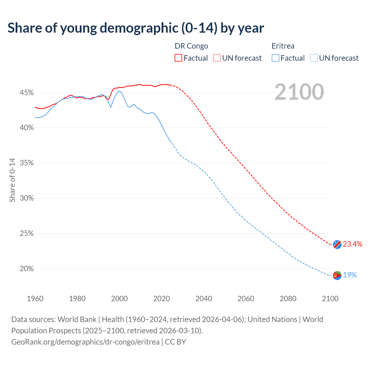 - The share of young demographic (0-15 years old) in the DR Congo is 46% vs 38.1% in Eritrea.