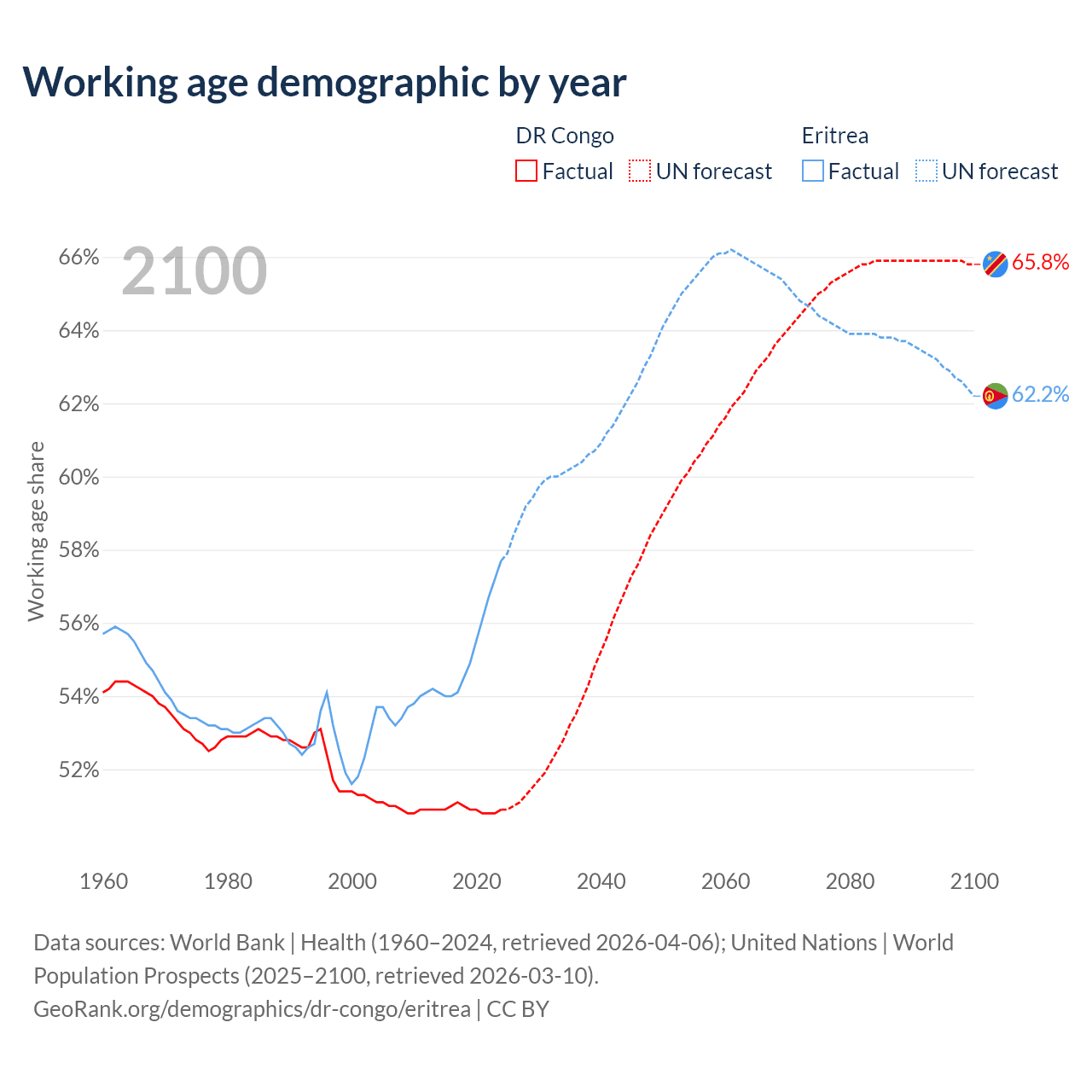 - The DR Congo has 59.8M working age adults (aged 15-64) vs 2.13M in Eritrea.