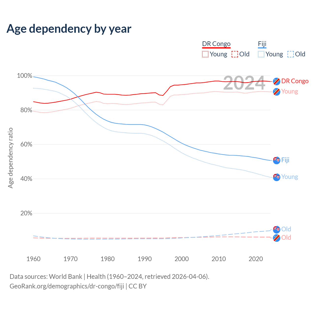 - The share of old-age demographic (65+) in the DR Congo is 3.08% vs 6.49% in Fiji.