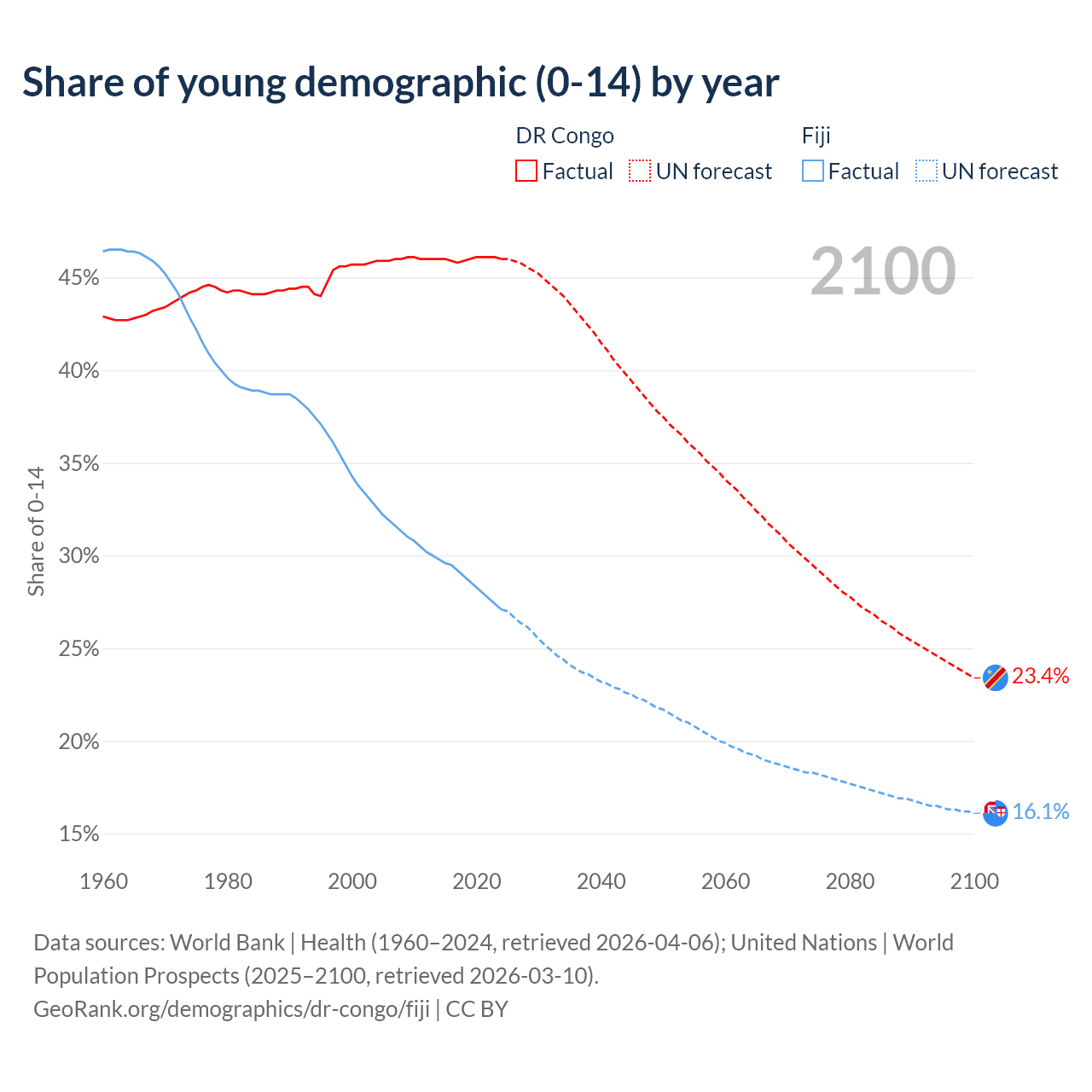 - The share of young demographic (0-15 years old) in the DR Congo is 46% vs 27.1% in Fiji.
