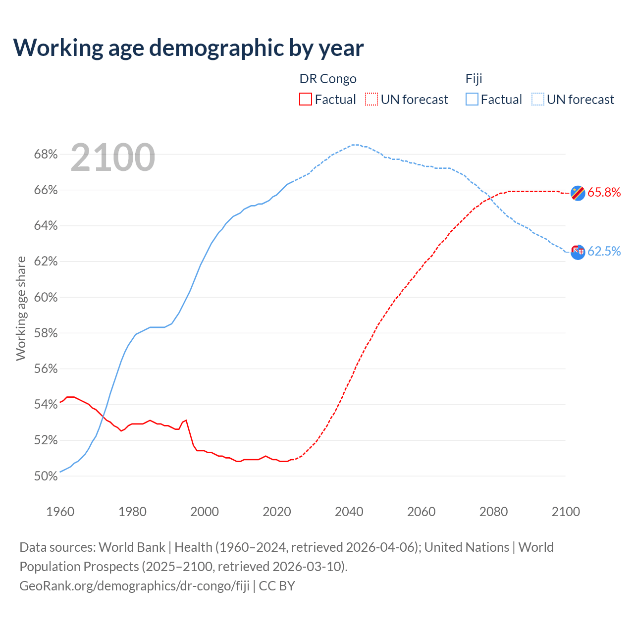 The share of older people aged 65 and over is 3.08% in the DR Congo and 6.49% in Fiji. Life expectancy in the DR Congo compared to Fiji .