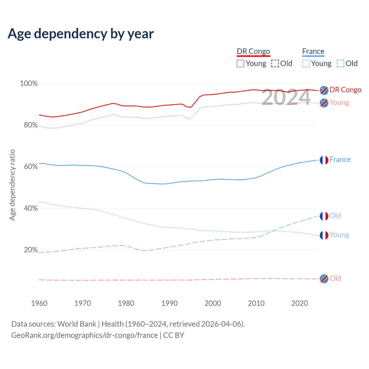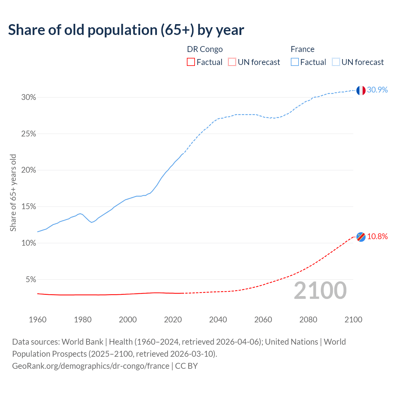 - The share of old-age demographic (65+) in the DR Congo is 3.08% vs 22.1% in France.