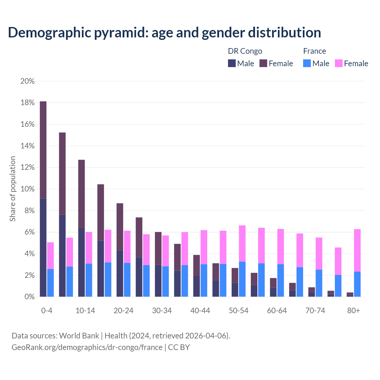 - The DR Congo is ranked 191/196 by median age (oldest to youngest) vs 29/196 for France.