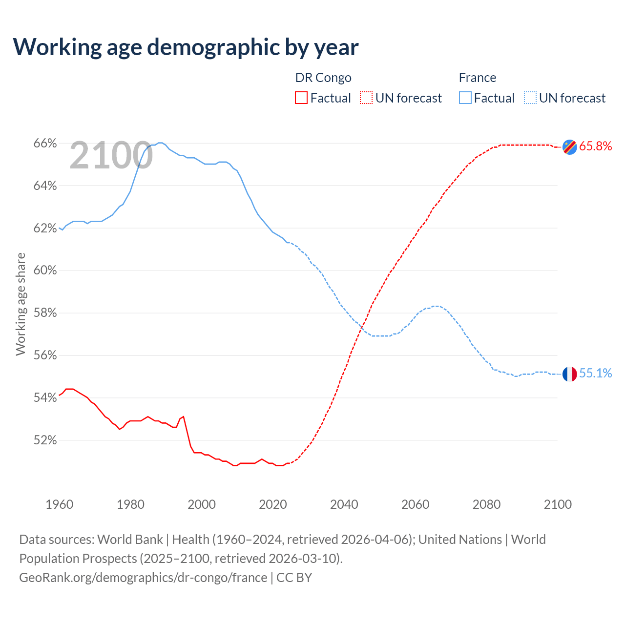 - The DR Congo has 59.8M working age adults (aged 15-64) vs 42.2M in France.
