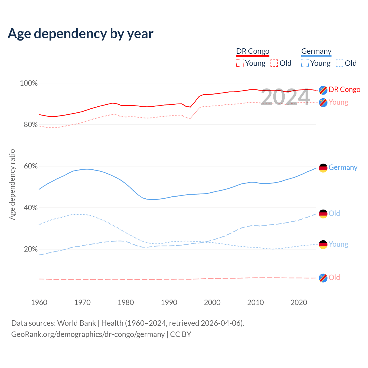 - The DR Congo is ranked 191/196 by median age (oldest to youngest) vs 9/196 for Germany.