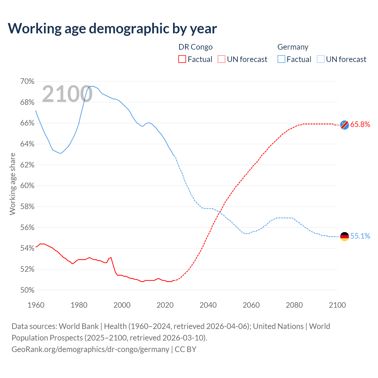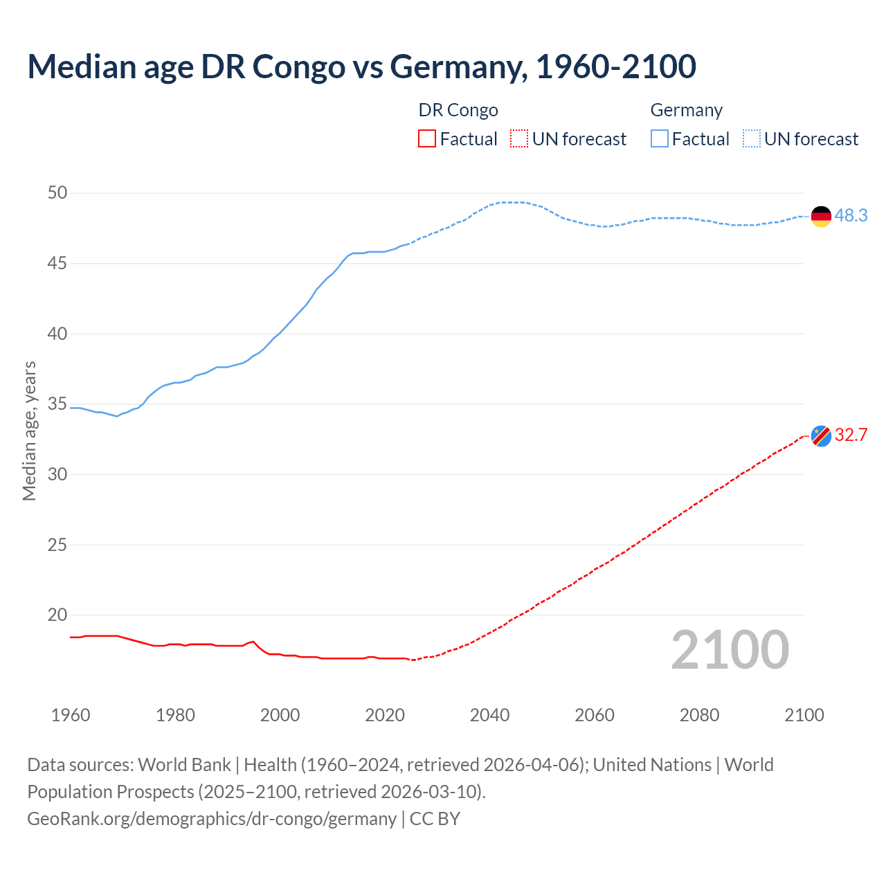 Median age DR Congo vs Germany, 1960-2100