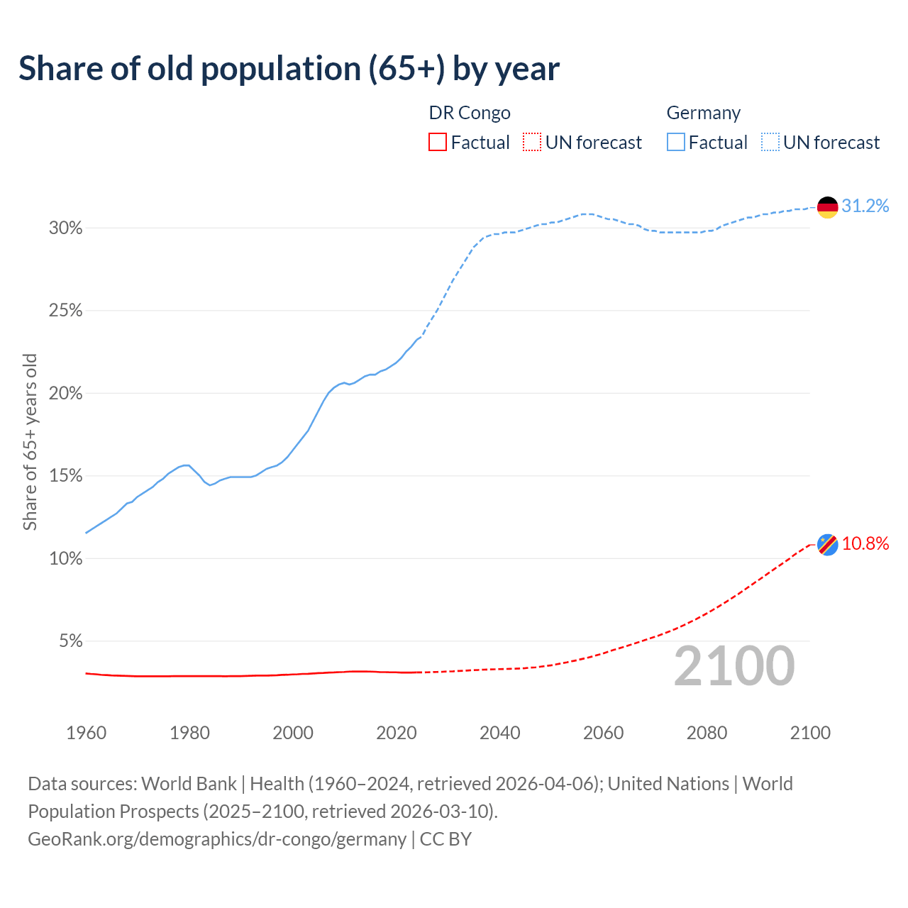 The share of older people aged 65 and over is 3.08% in the DR Congo and 23.2% in Germany. Life expectancy in the DR Congo compared to Germany .