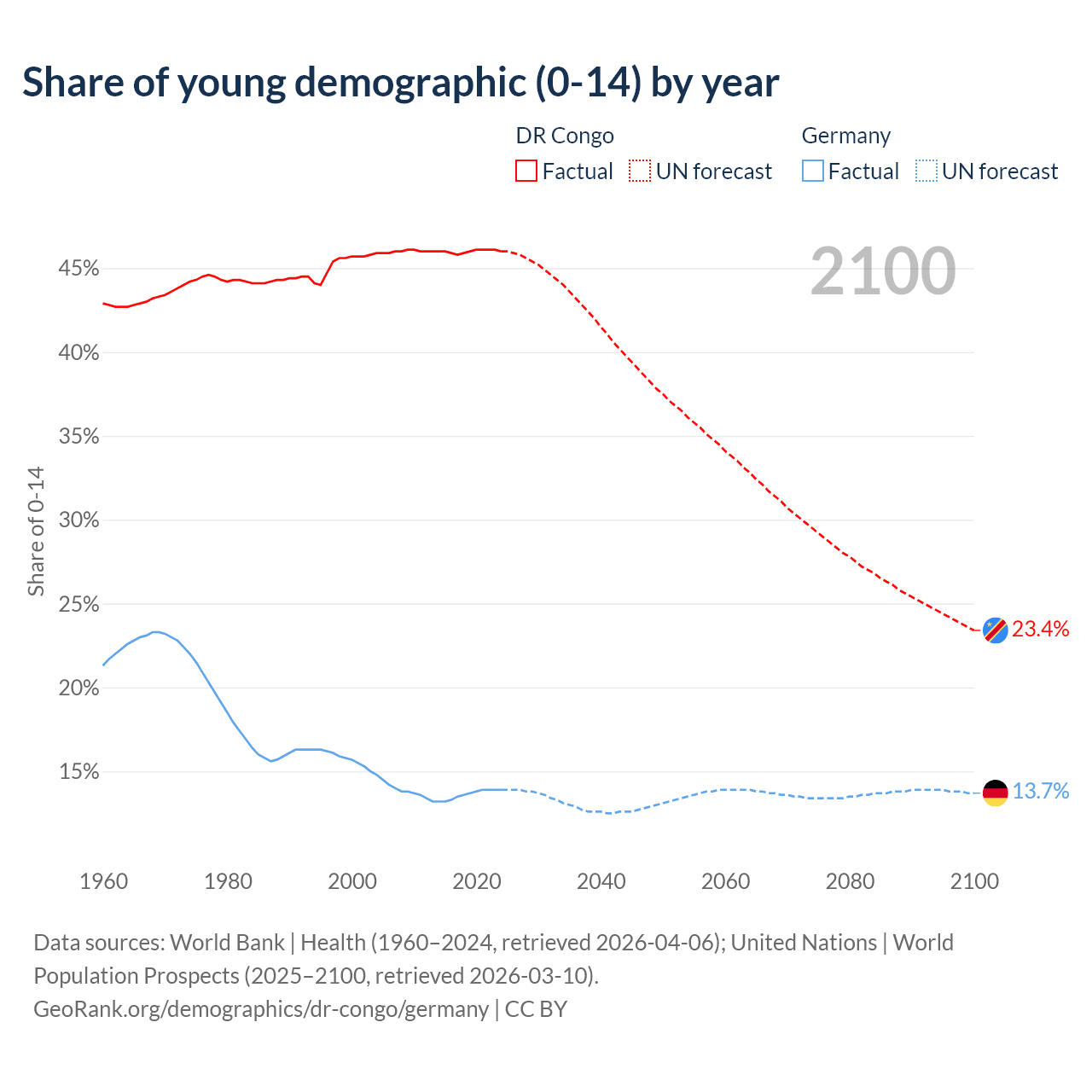 - The share of young demographic (0-15 years old) in the DR Congo is 46% vs 13.9% in Germany.