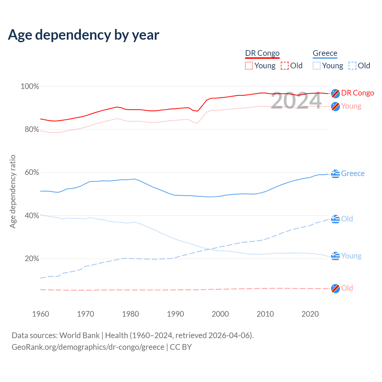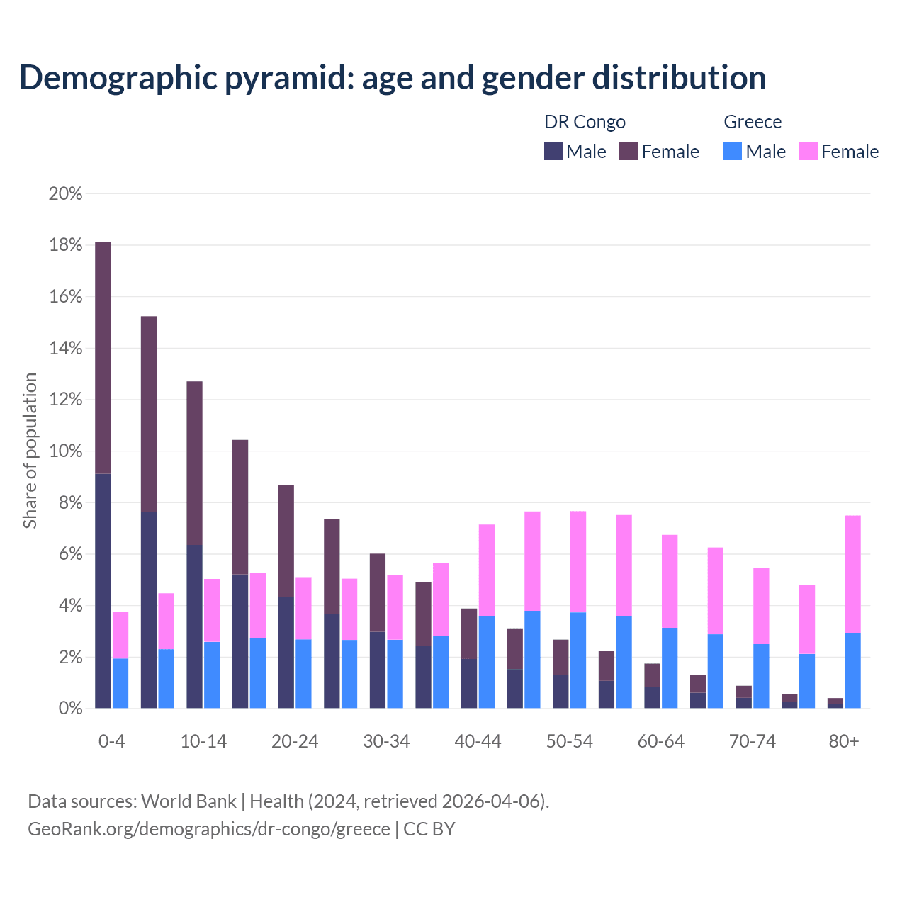 - The share of old-age demographic (65+) in the DR Congo is 3.08% vs 23.9% in Greece.