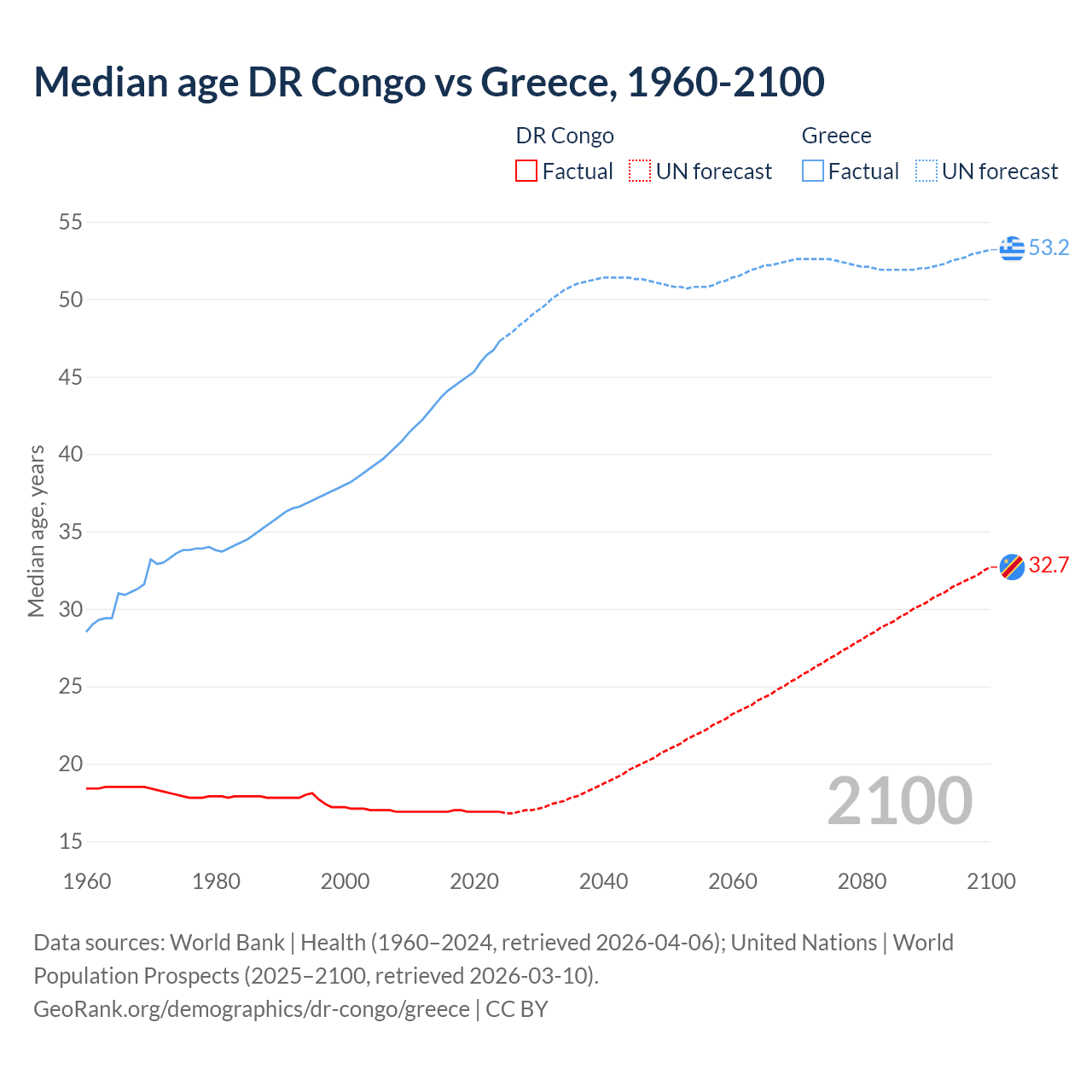 Median age DR Congo vs Greece, 1960-2100