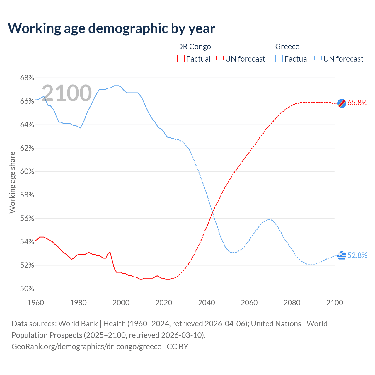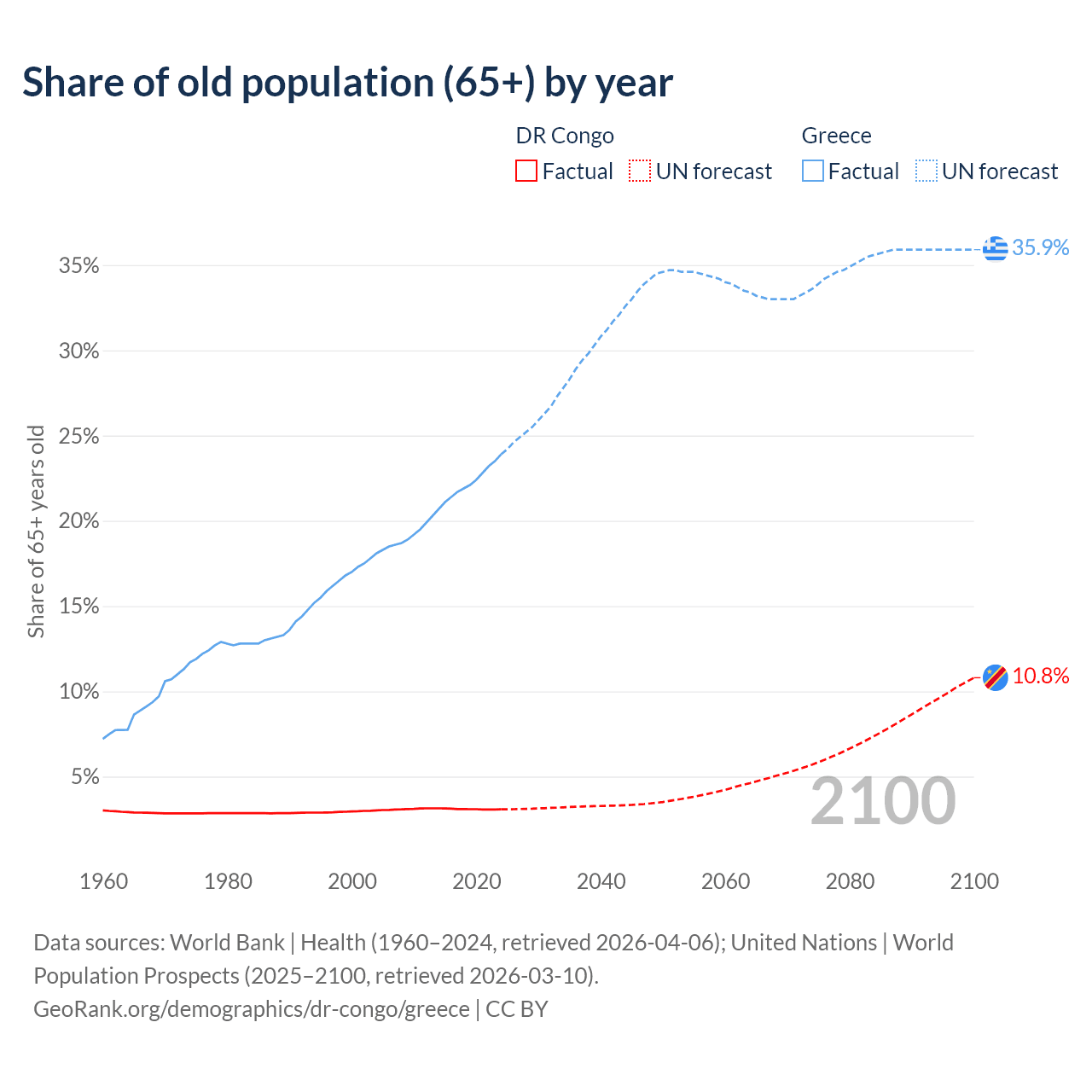 The share of older people aged 65 and over is 3.08% in the DR Congo and 23.9% in Greece. Life expectancy in the DR Congo compared to Greece .