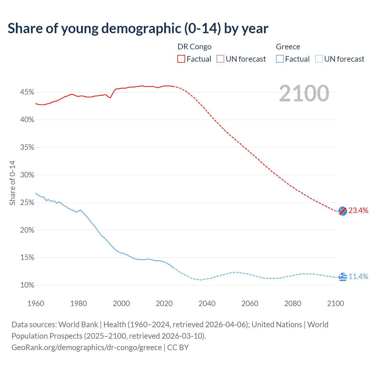 - The share of young demographic (0-15 years old) in the DR Congo is 46% vs 13.2% in Greece.