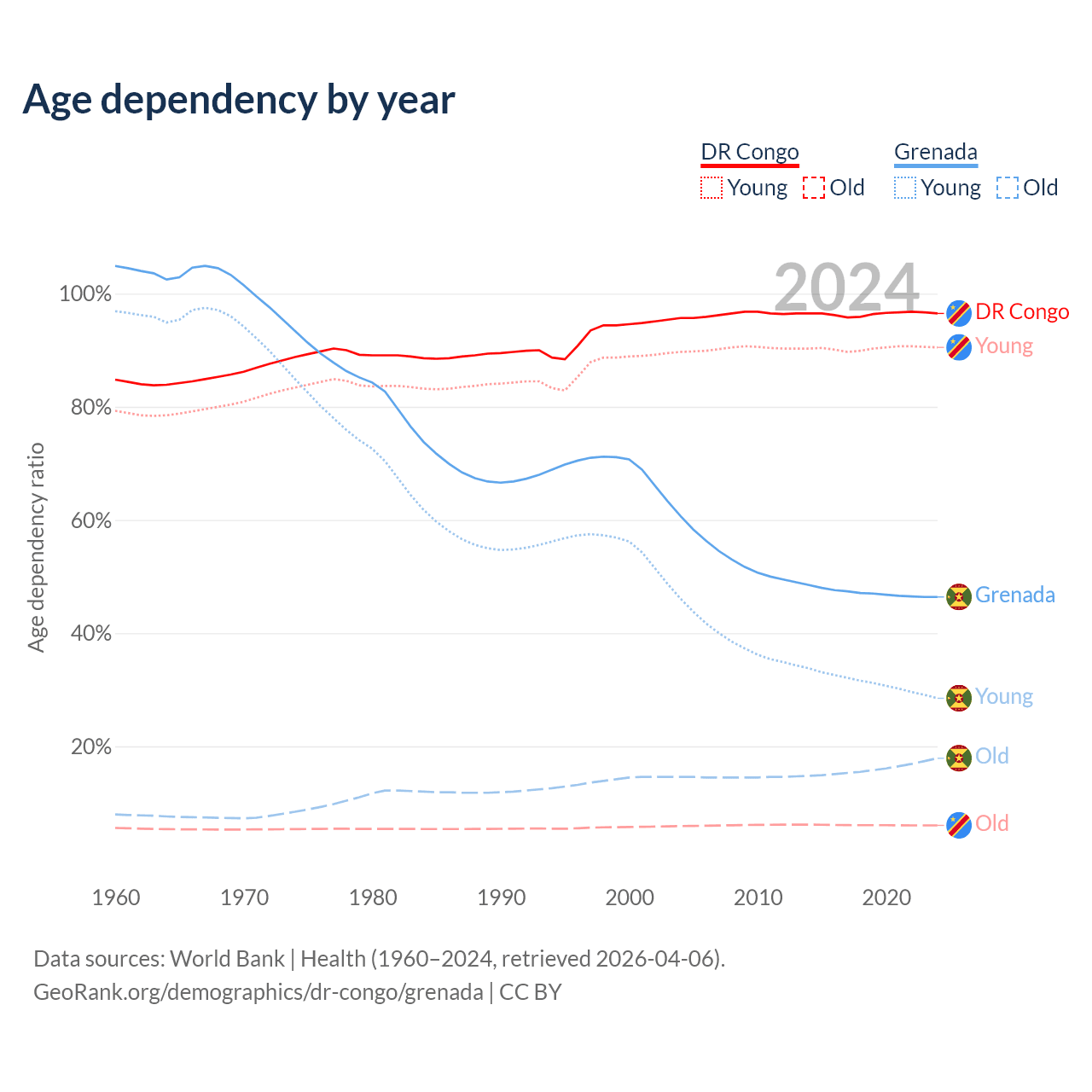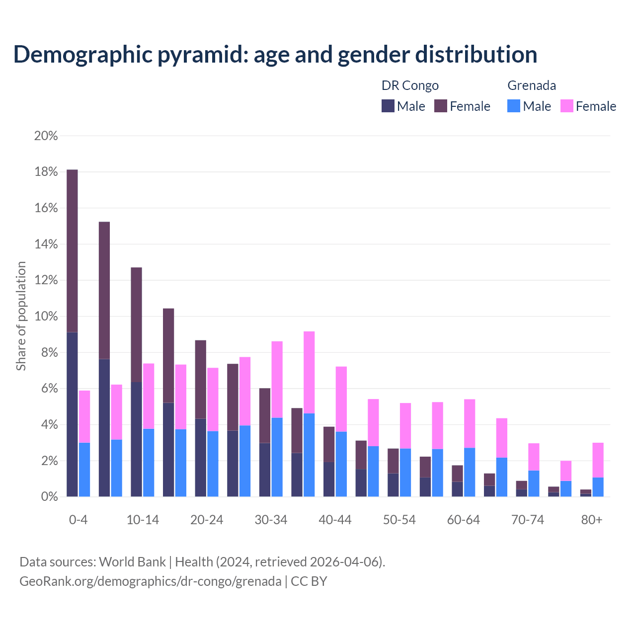 - The share of old-age demographic (65+) in the DR Congo is 3.08% vs 12.2% in Grenada.
