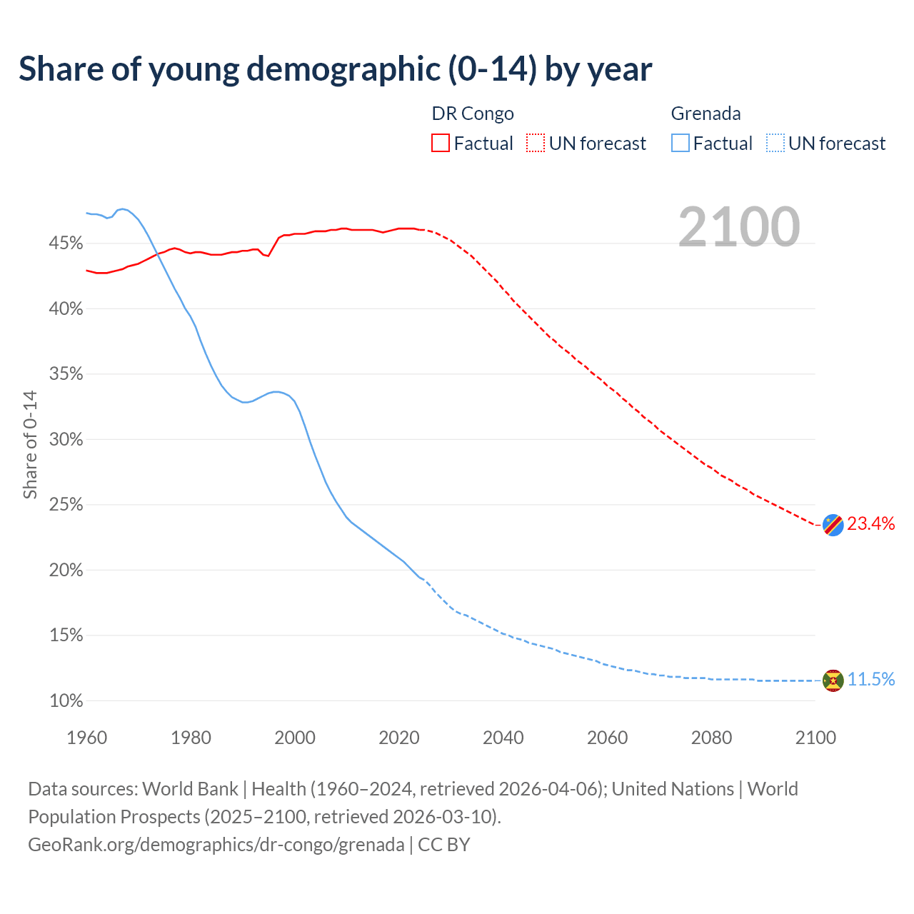 - The share of young demographic (0-15 years old) in the DR Congo is 46% vs 19.4% in Grenada.
