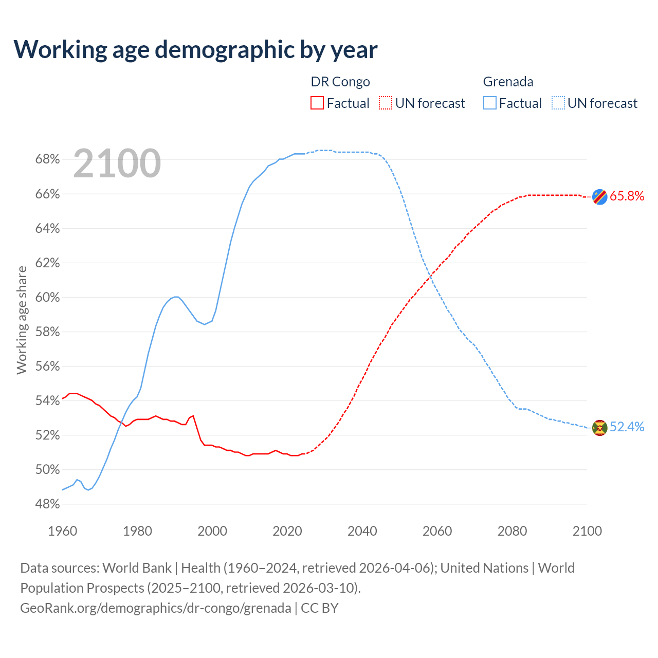 - The DR Congo has 59.8M working age adults (aged 15-64) vs 80.2K in Grenada.