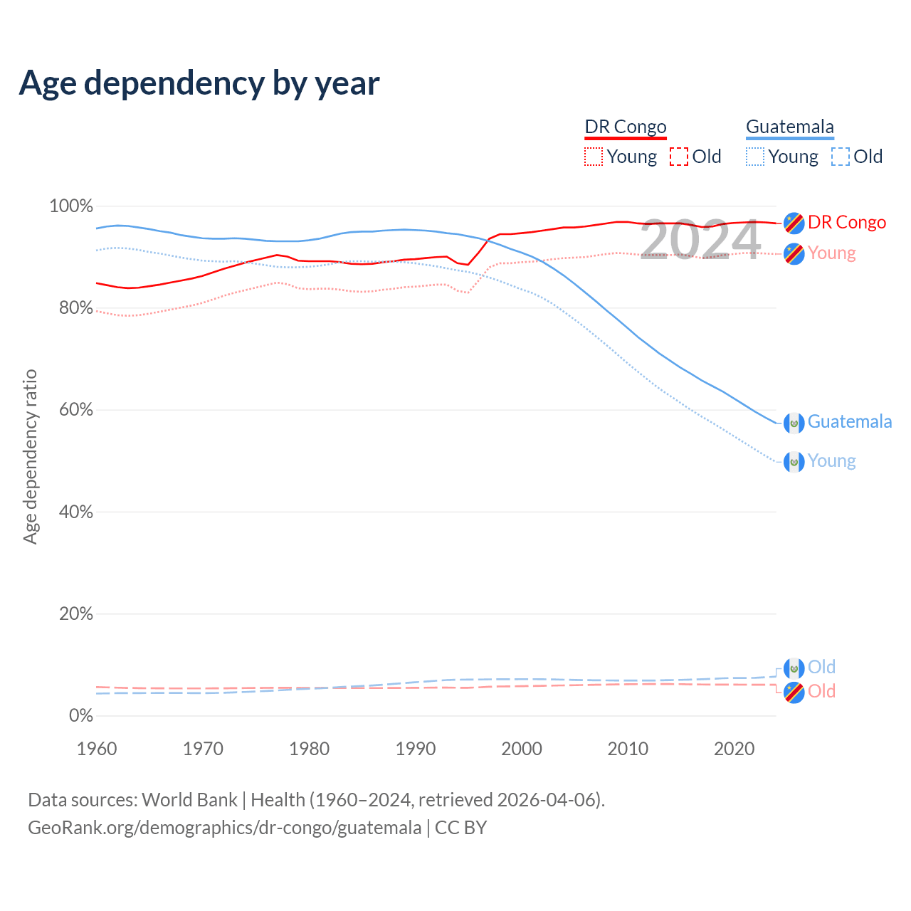- The share of old-age demographic (65+) in the DR Congo is 3.08% vs 4.85% in Guatemala.